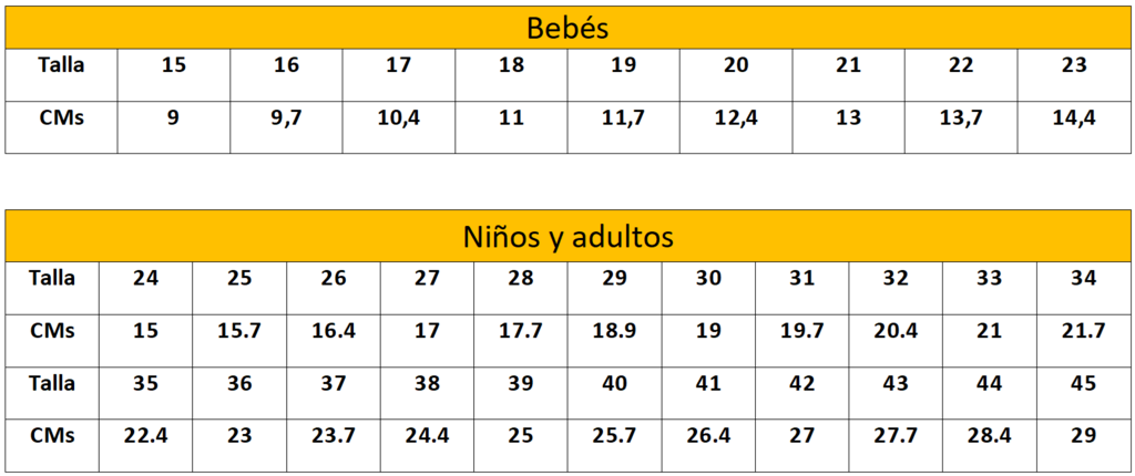 5- Con esa medida en centímetros que obtienes, puedes compararla con la tabla de medidas que vienen Guía de tallas, y así elegir la talla correcta en función de esa medida.