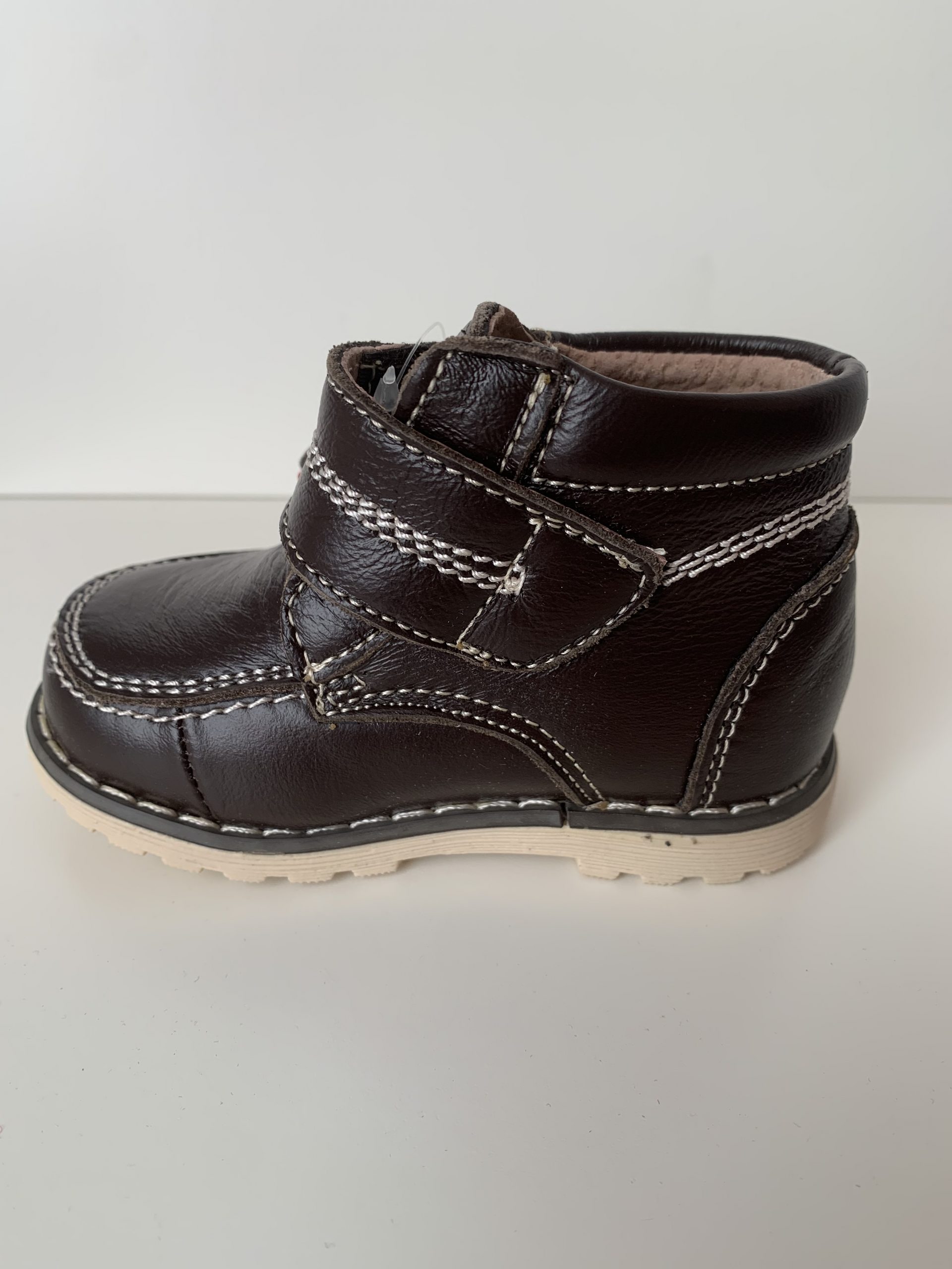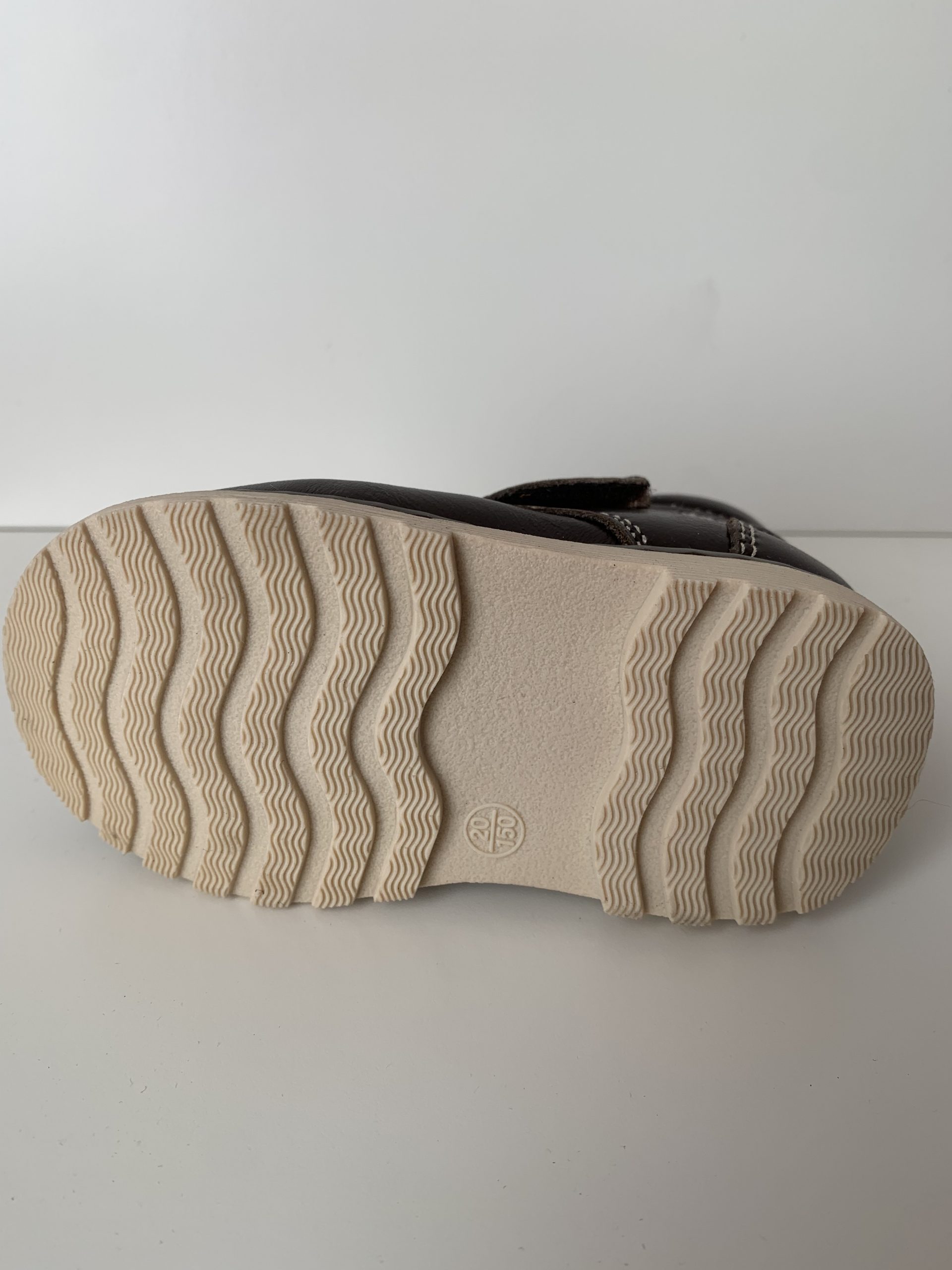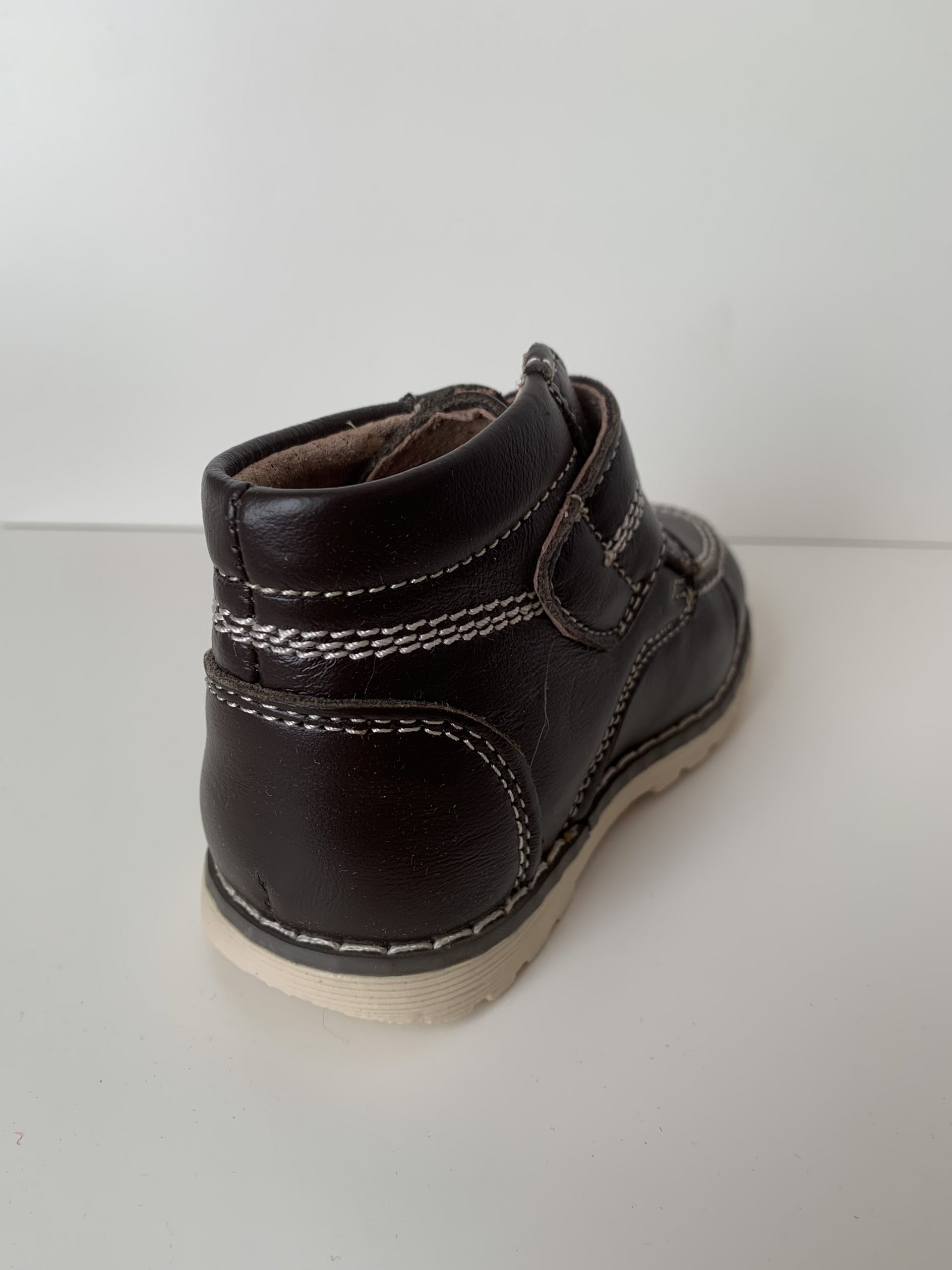 Bota de piel marrón oscuro, perpuntes en color beige, con cierre de velcro y suela en color crema. Son Ideales unisex tipo kickers, para los más pequeños. Hechas en España por Bonino.