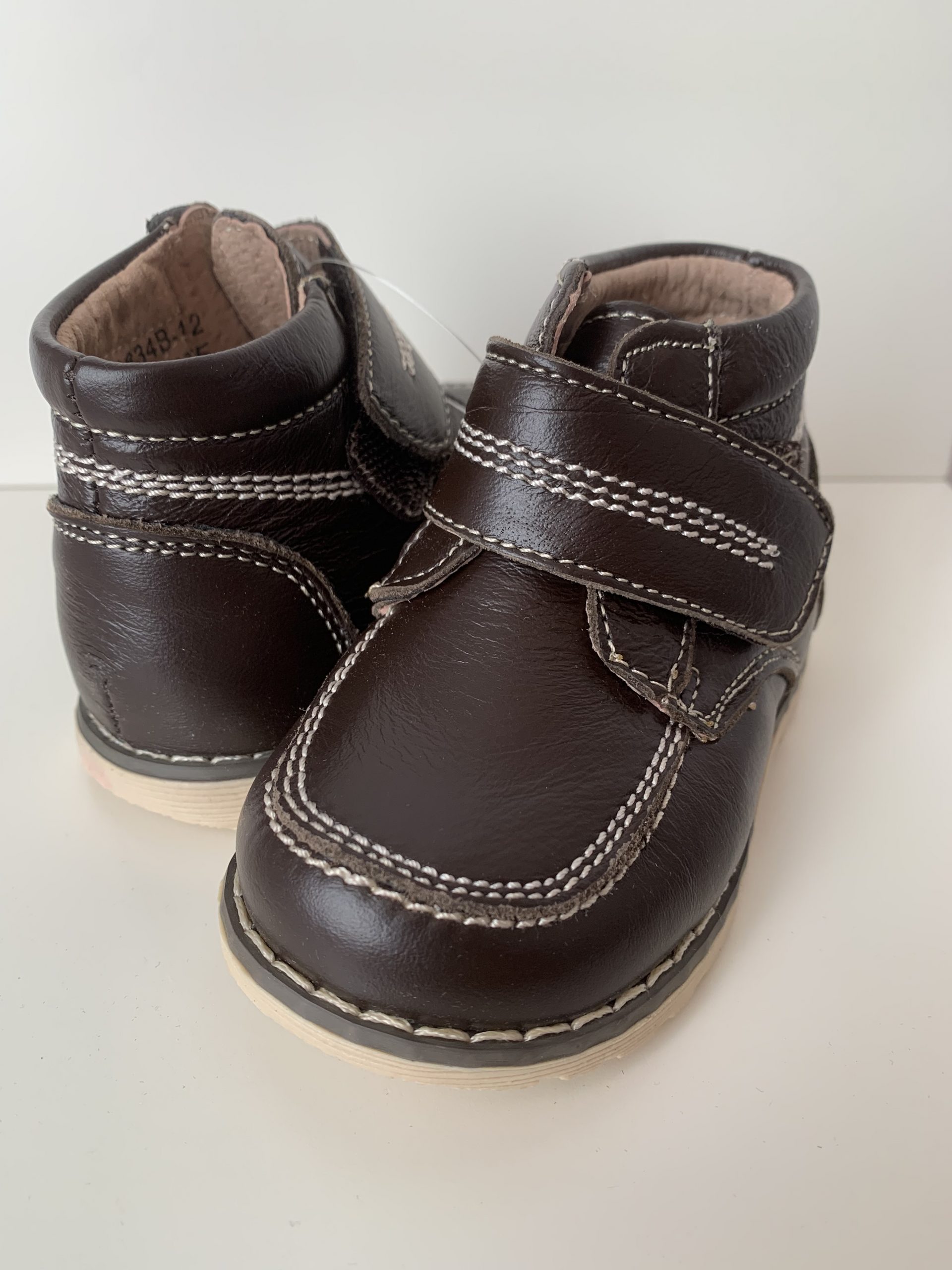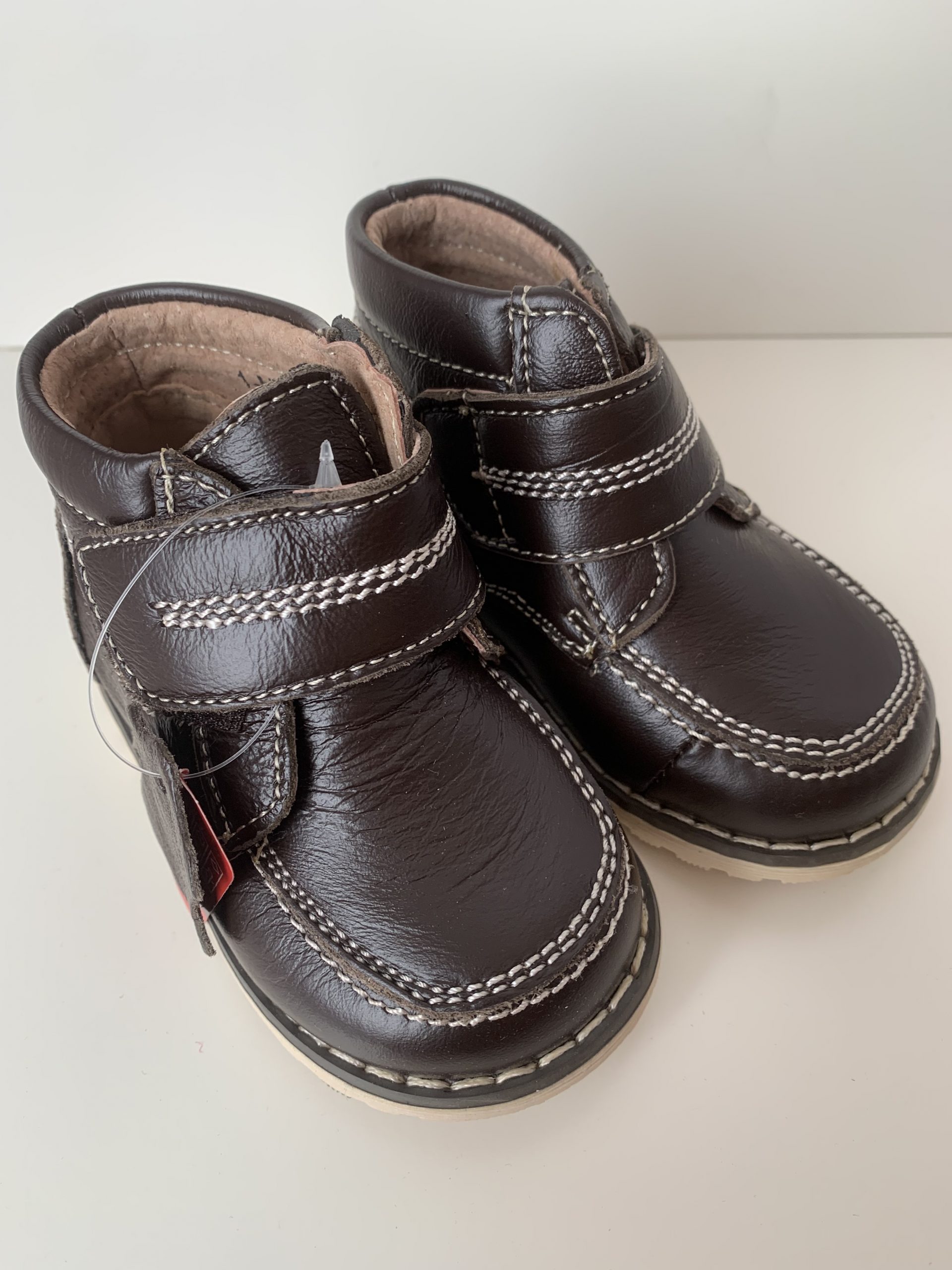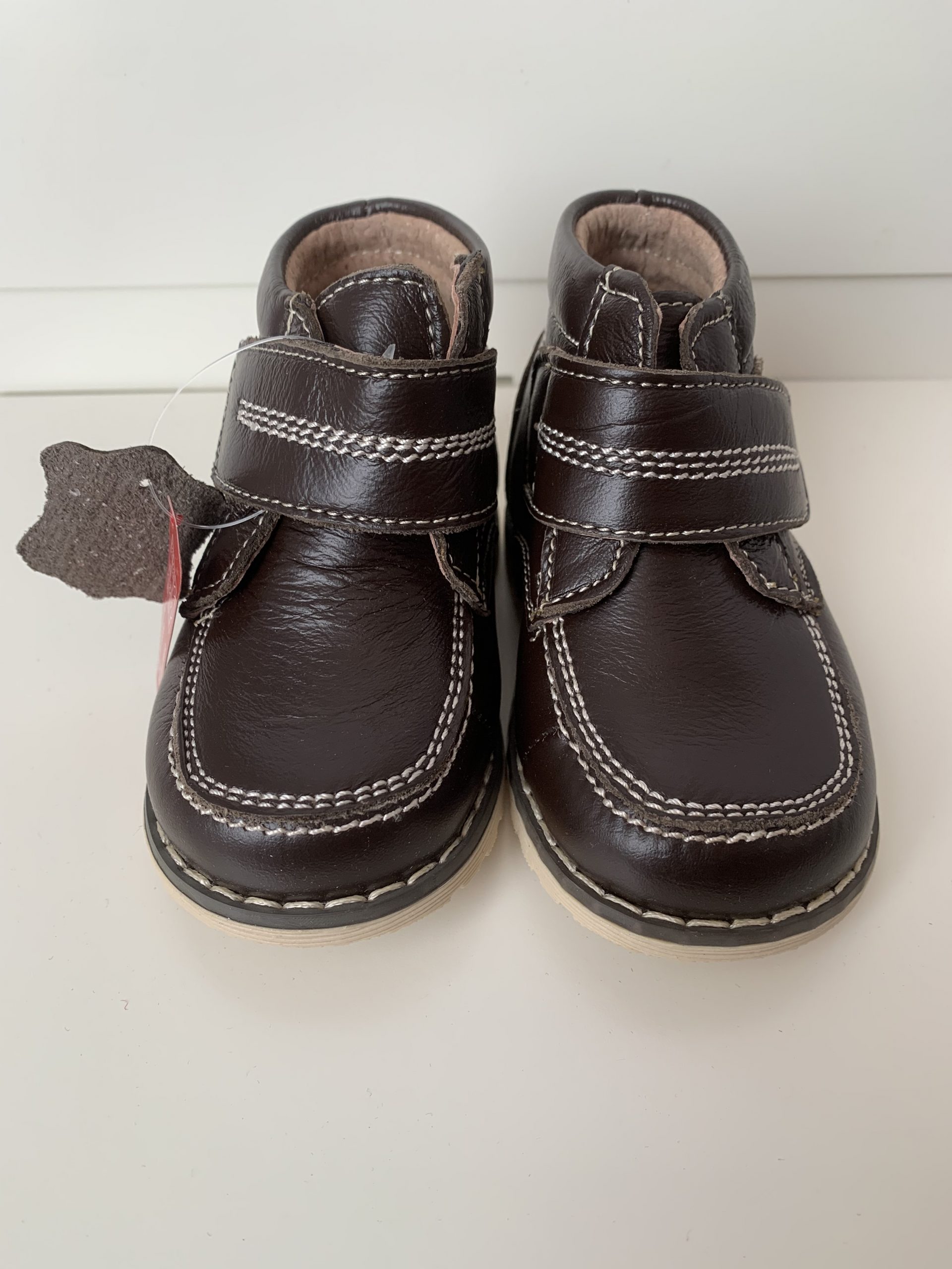 Bota de piel marrón oscuro, perpuntes en color beige, con cierre de velcro y suela en color crema. Son Ideales unisex tipo kickers, para los más pequeños. Hechas en España por Bonino.