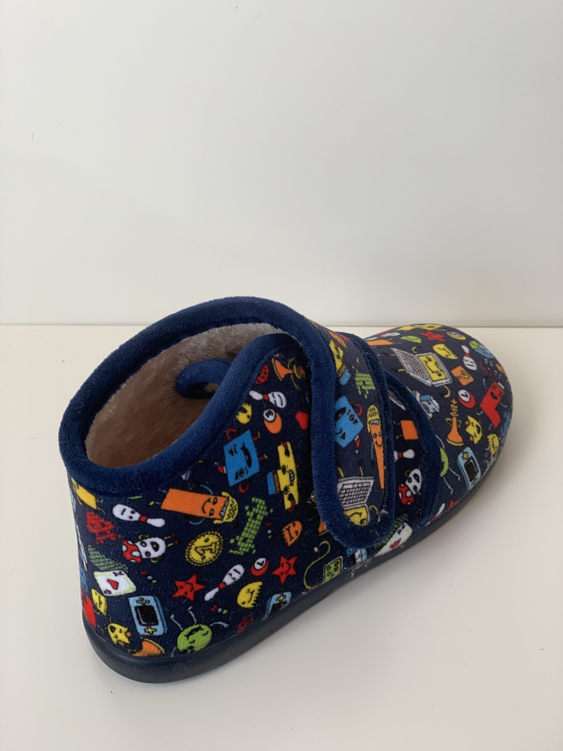 Zapatilla de casa con estampado aterciopelada con cierre de velcro. Son ideales para guarderías y para estar en casa son muy prácticas y calentitas para la sujeción de los pies de los mas pequeños. Hecho en España por Javer.