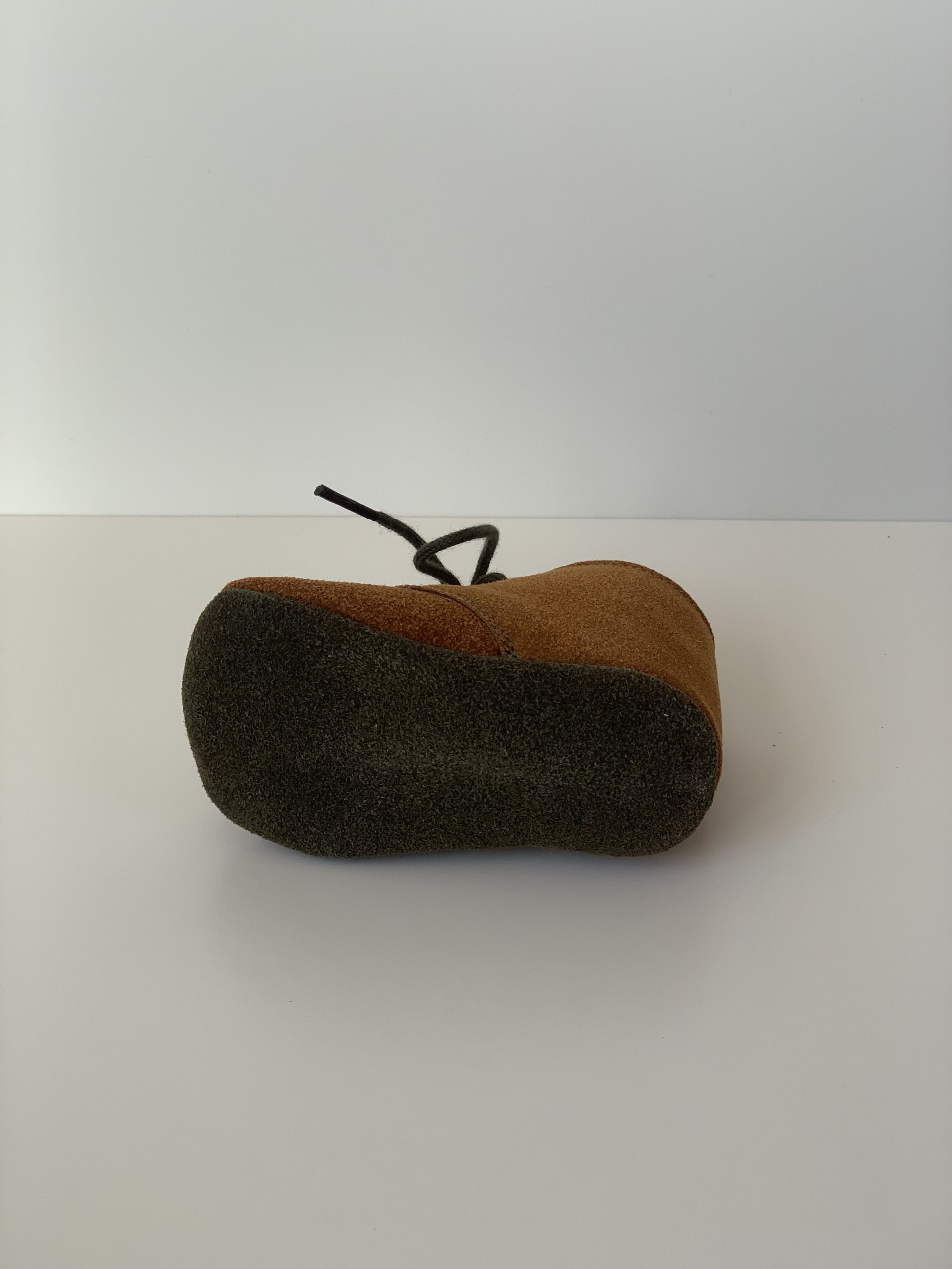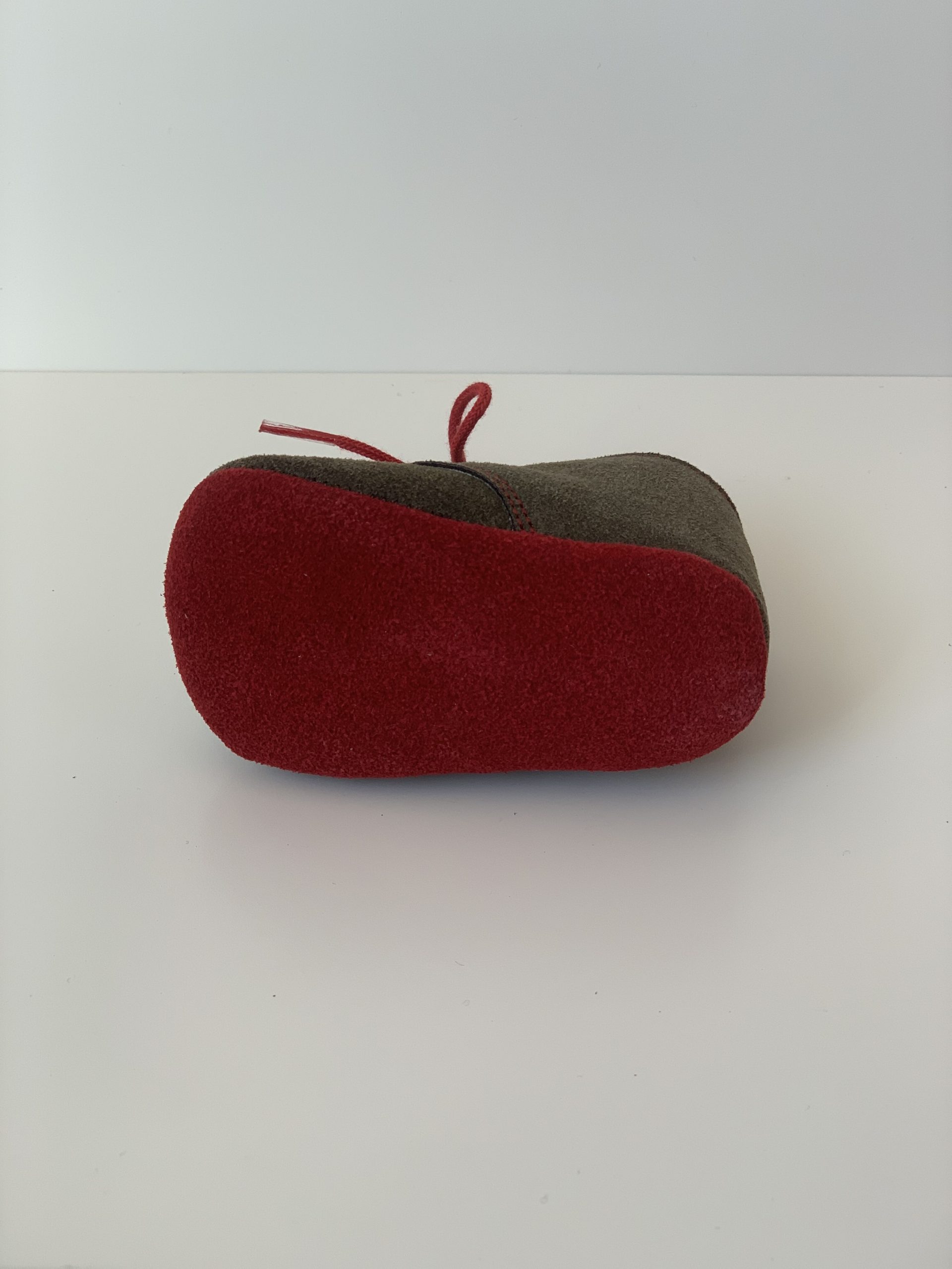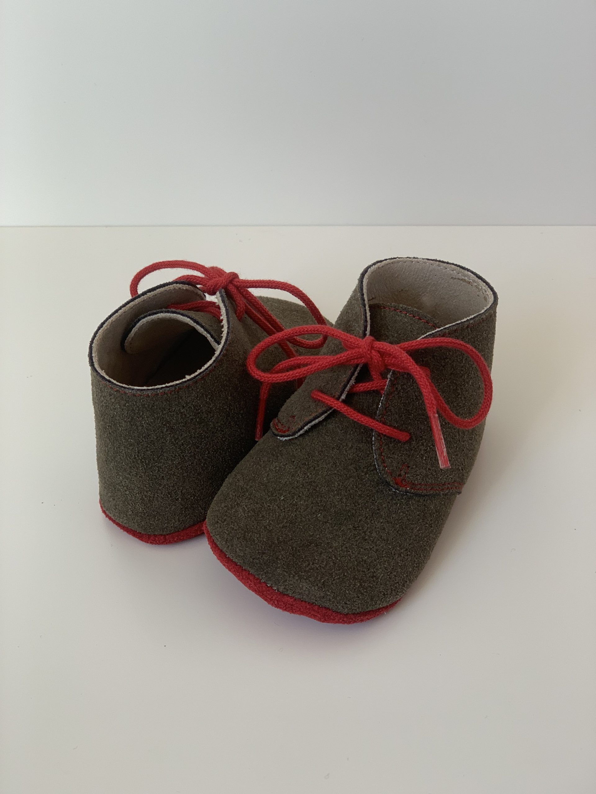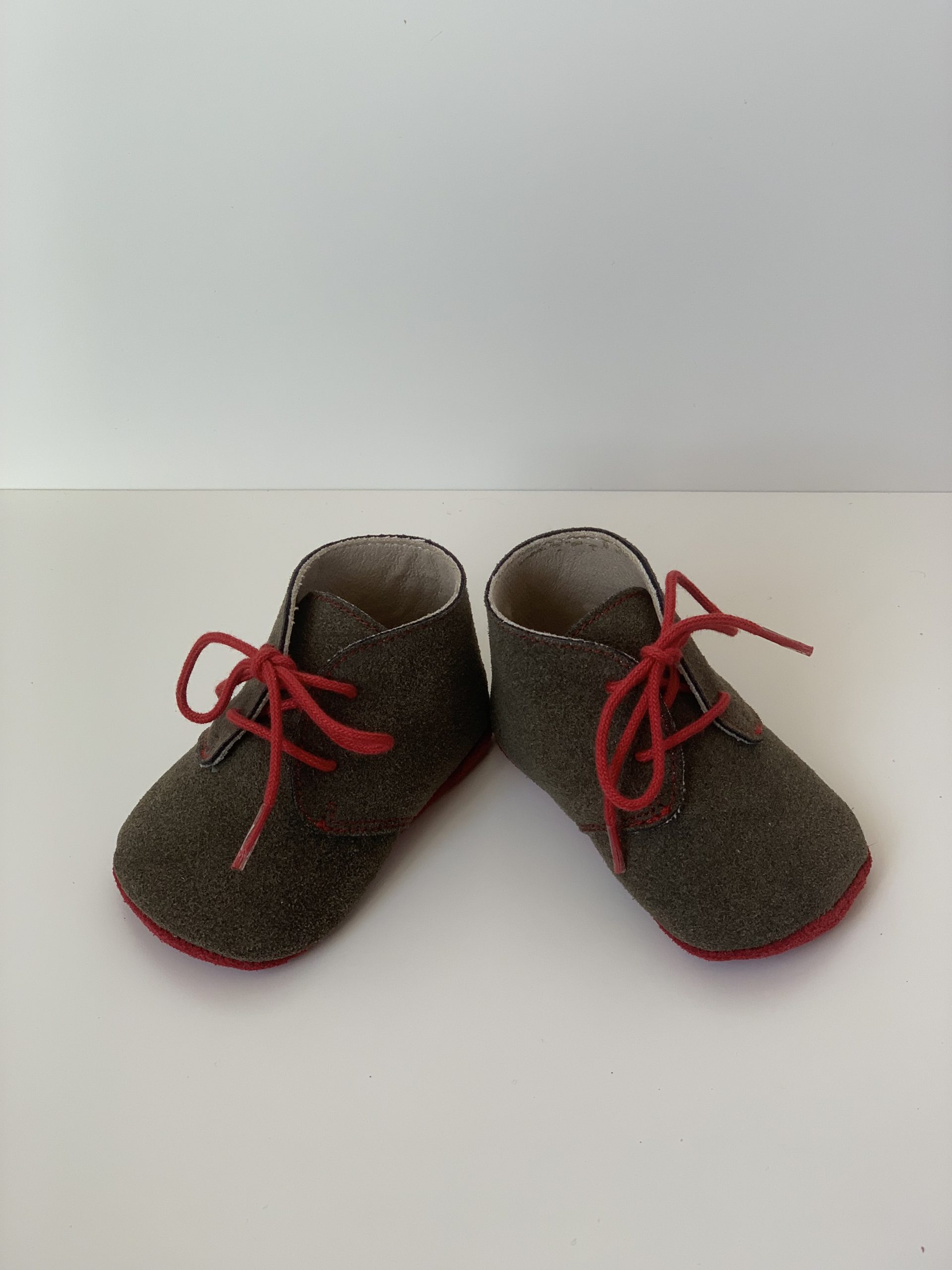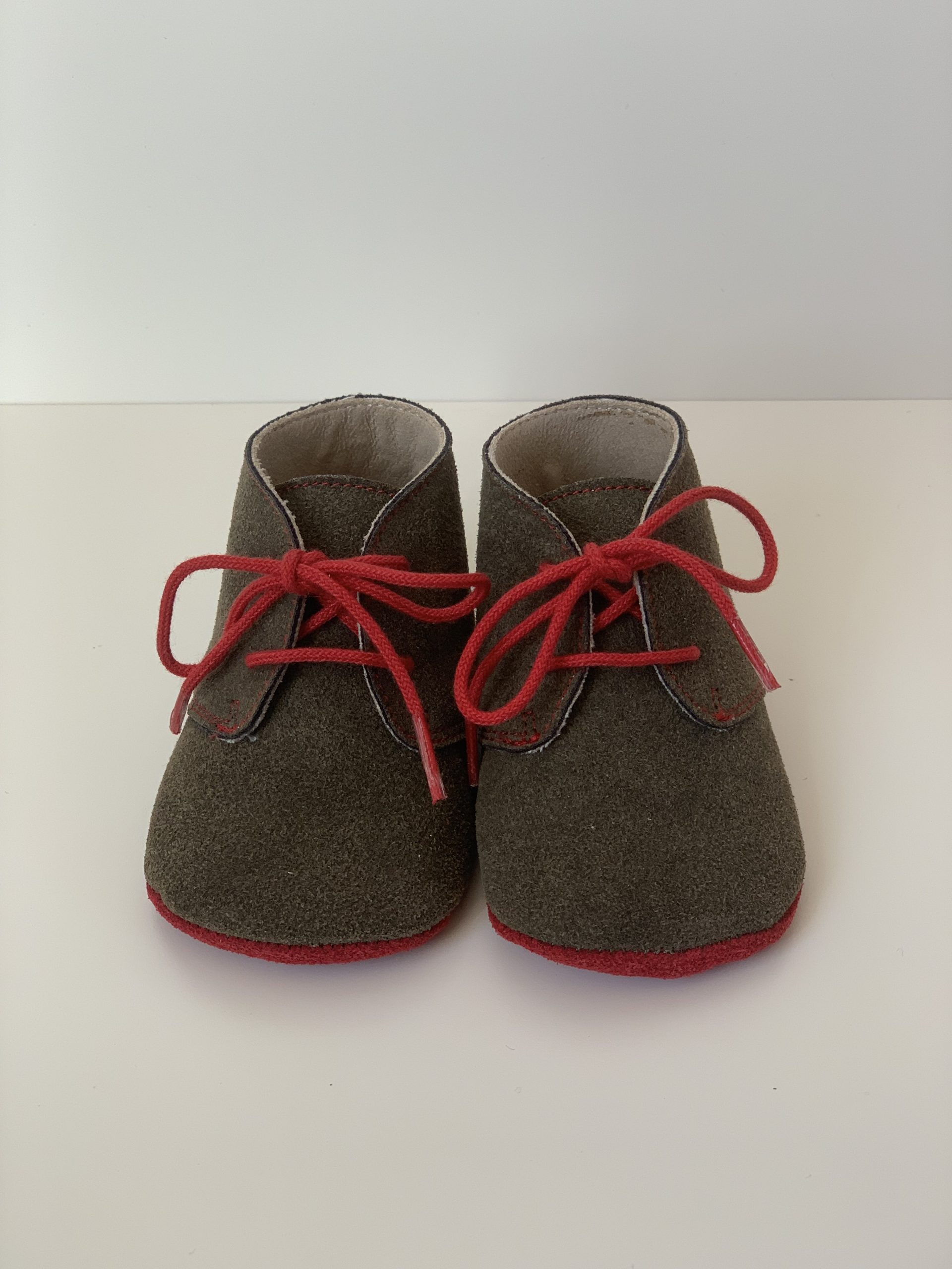 Botitas con cordones sin suela combinadas en serraje color cuero y kaki. Son muy cómodas y flexibles. Disponibles en dos colores: cuero/kaki y kaki/rojo. Fabricadas en España por la marca Quiques.