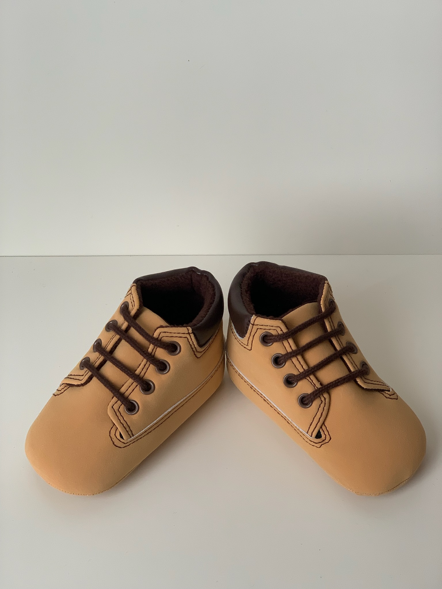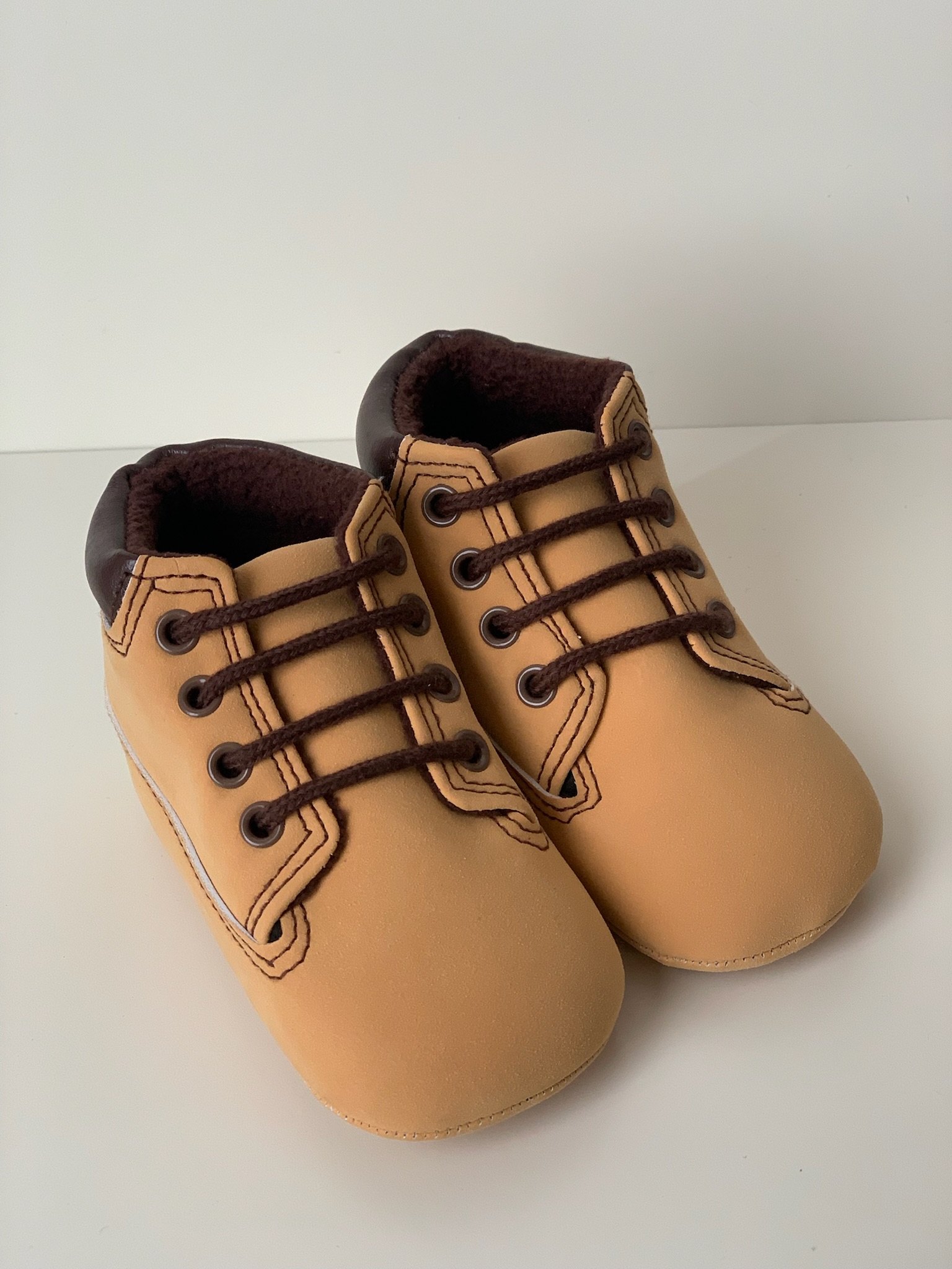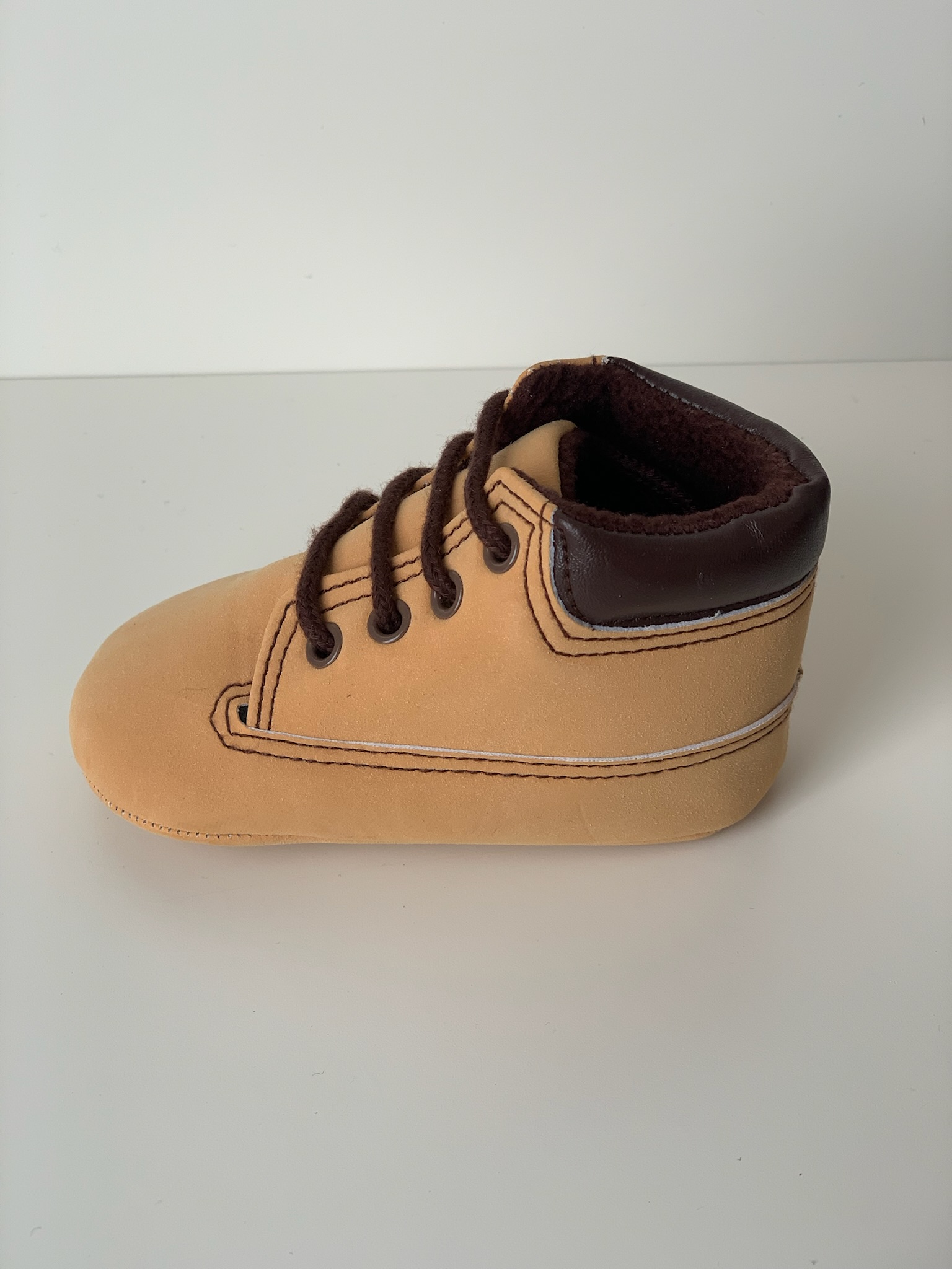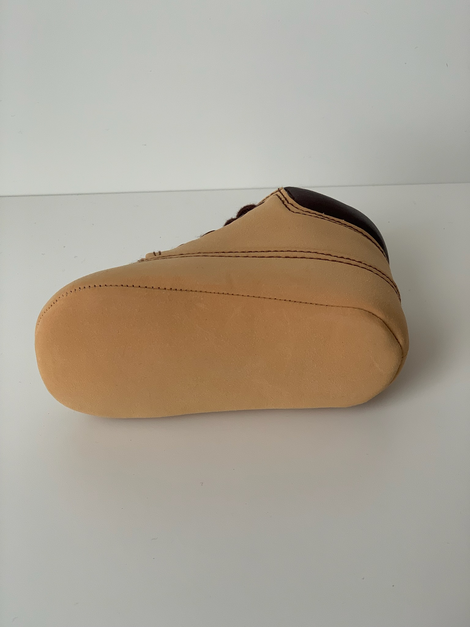Botita en color cuero con cierre de cordones marrones sin suela. Ideales para los mas pequeños son cómodas y flexibles. Fabricadas por la marca Bubble.