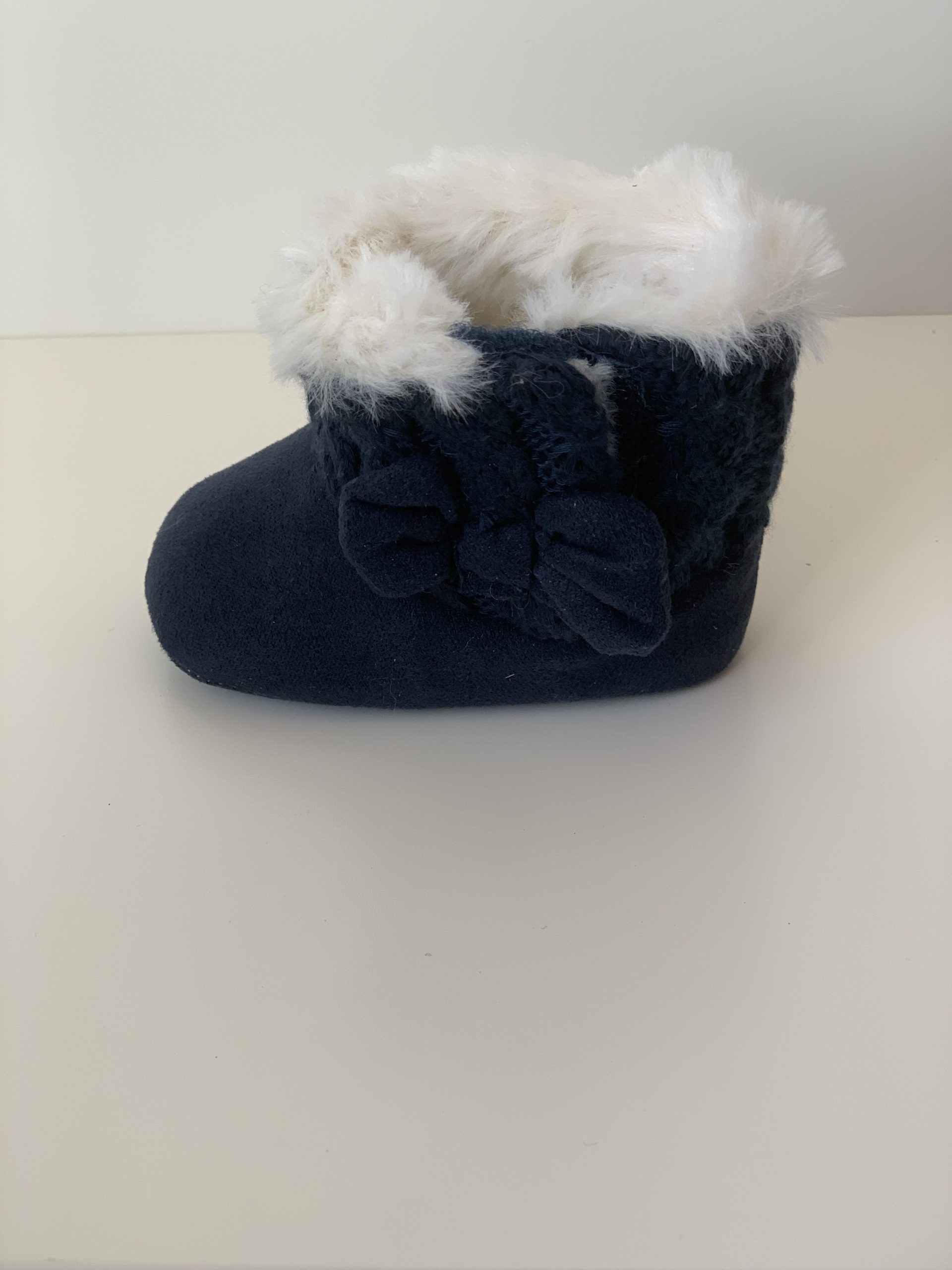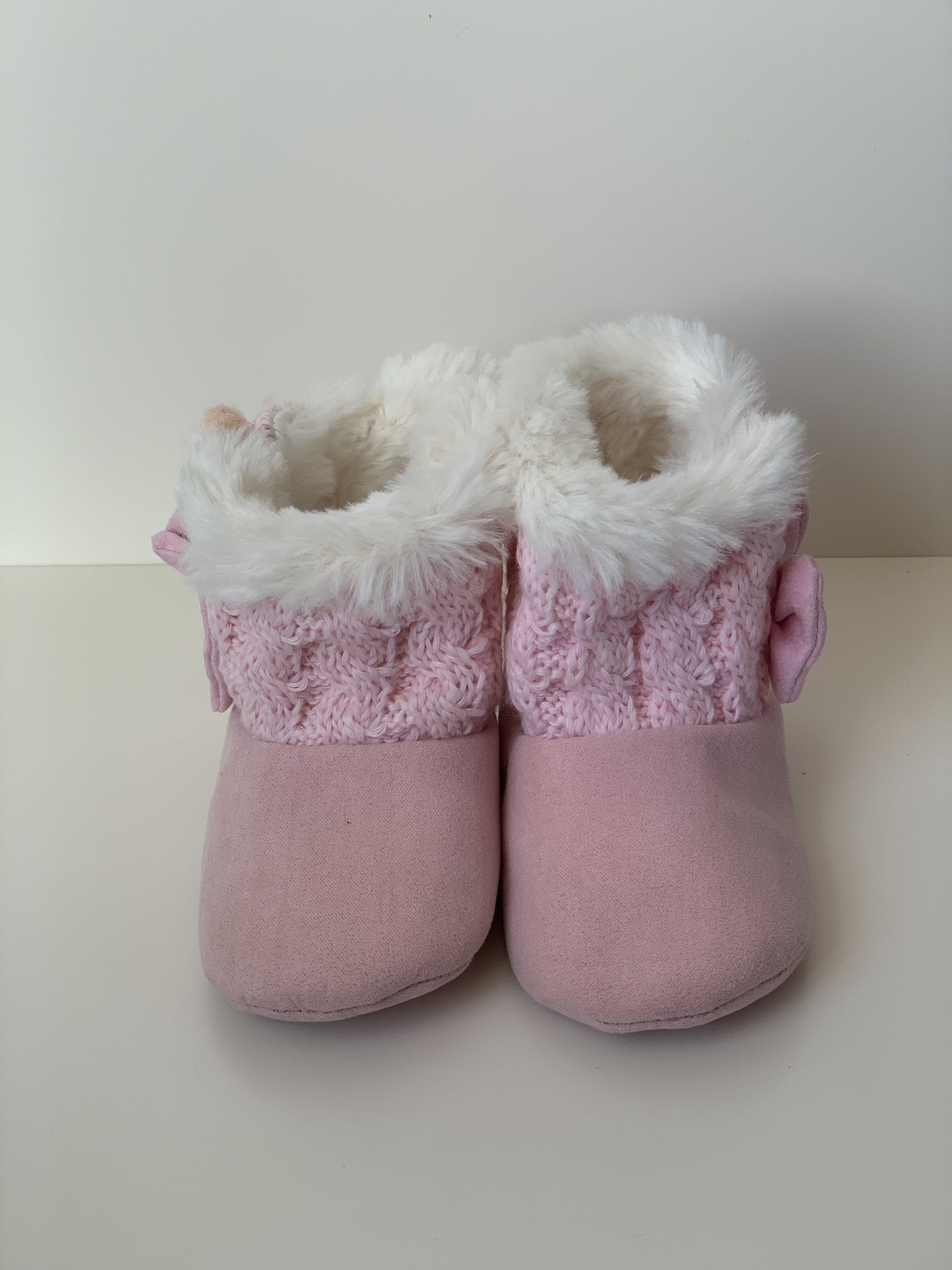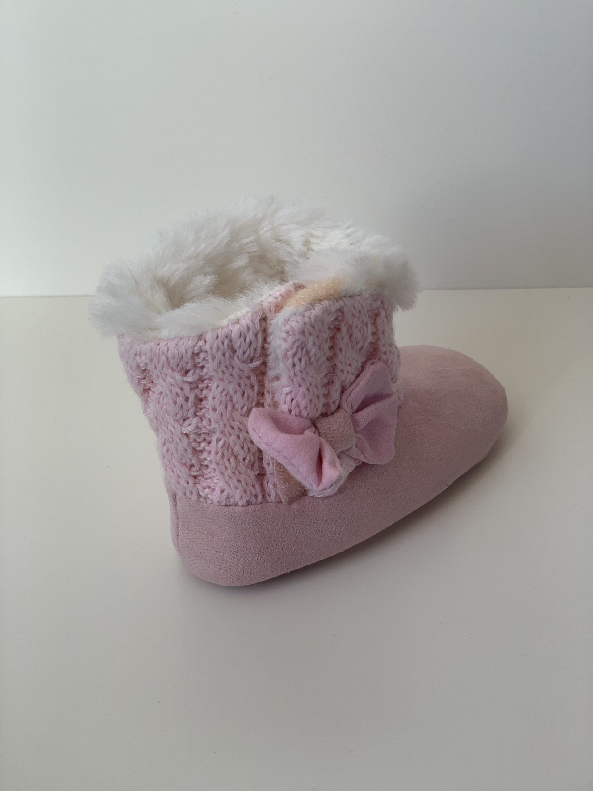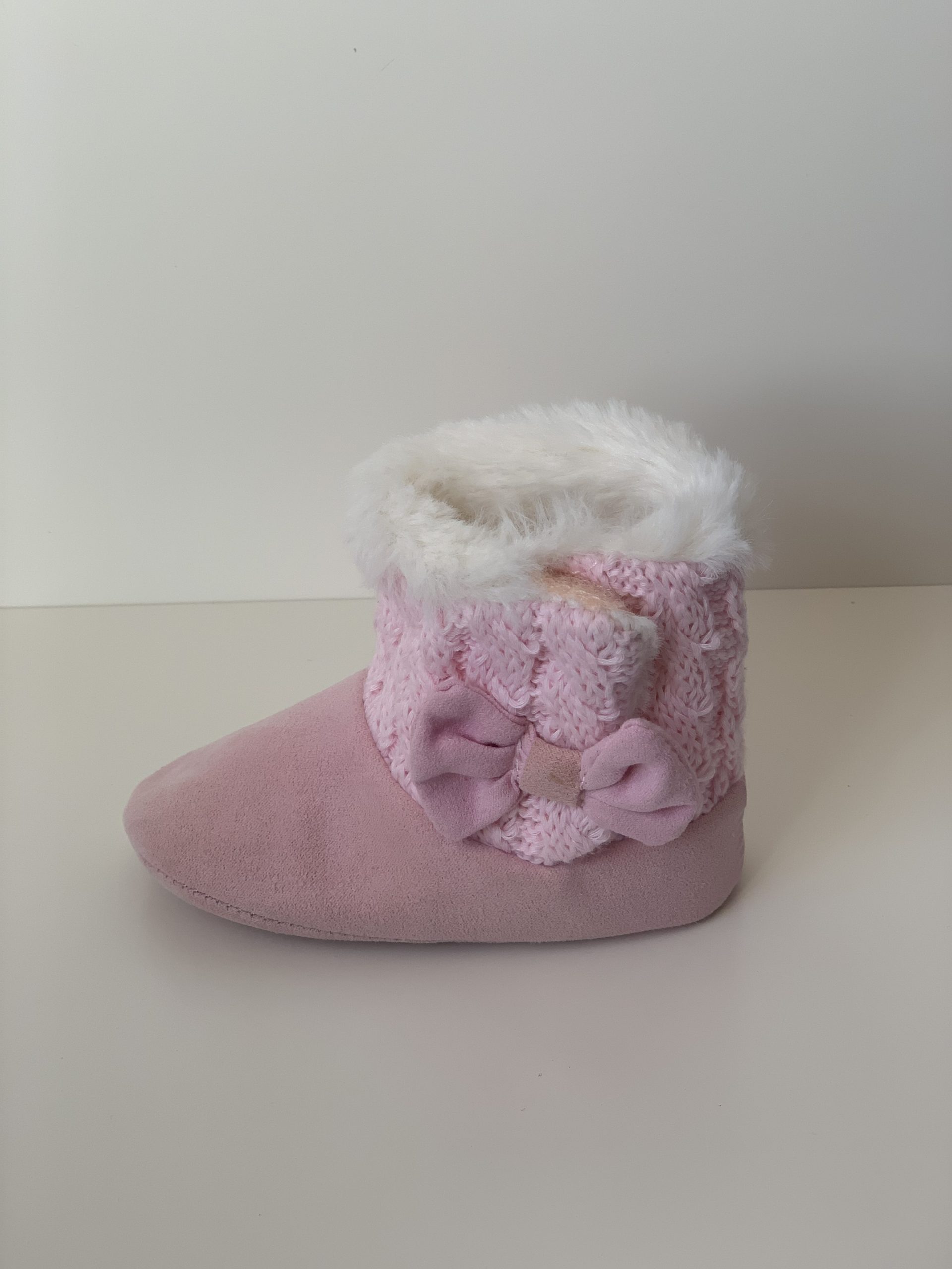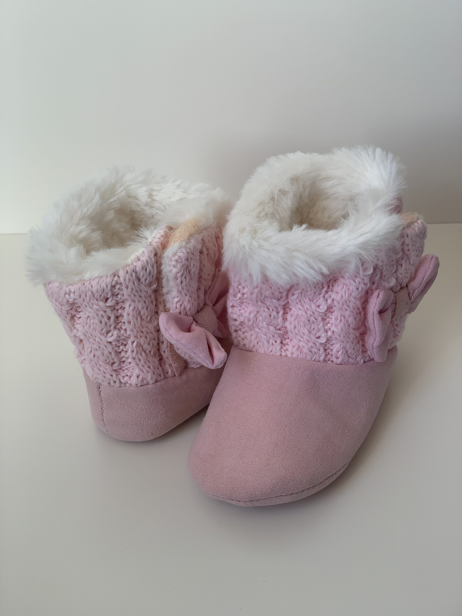 Botita para bebes en color rosa combinada con lana, forrada de pelito por dentro y con cierre de velcro adornado con lazo. Van sin suela son muy flexibles, ajustables con el velcro y fáciles de poner. Disponible en dos colores: en rosa y azul marino. Fabricadas por la marca Bubble.
