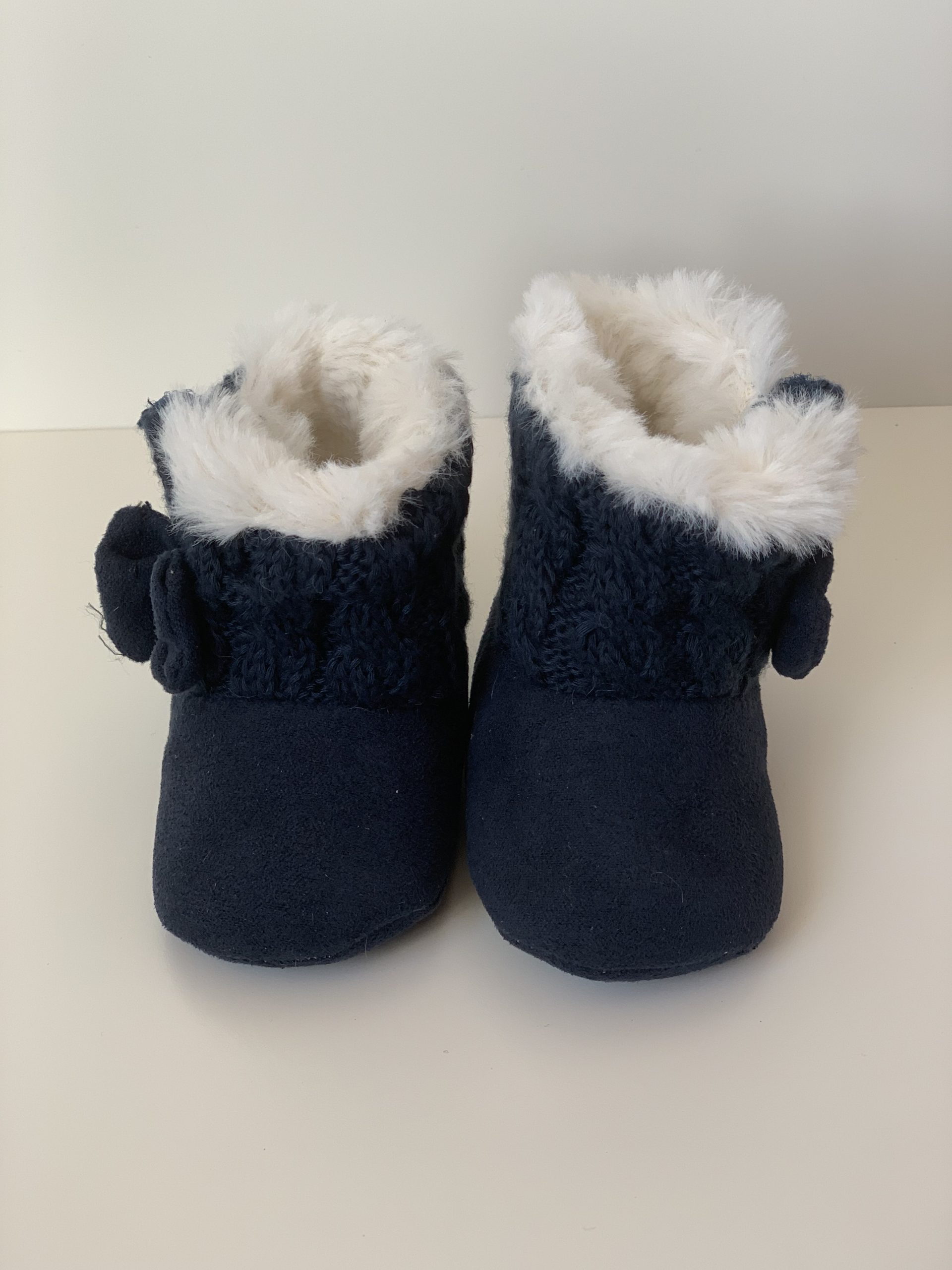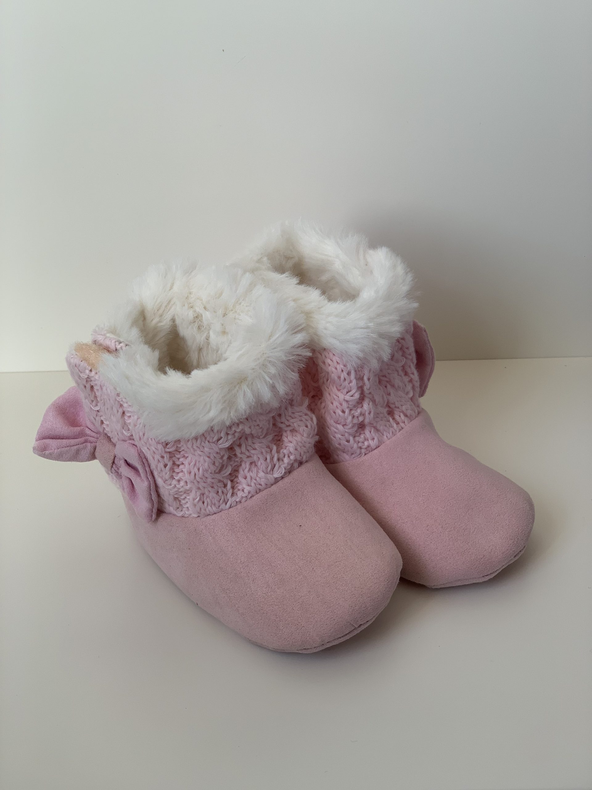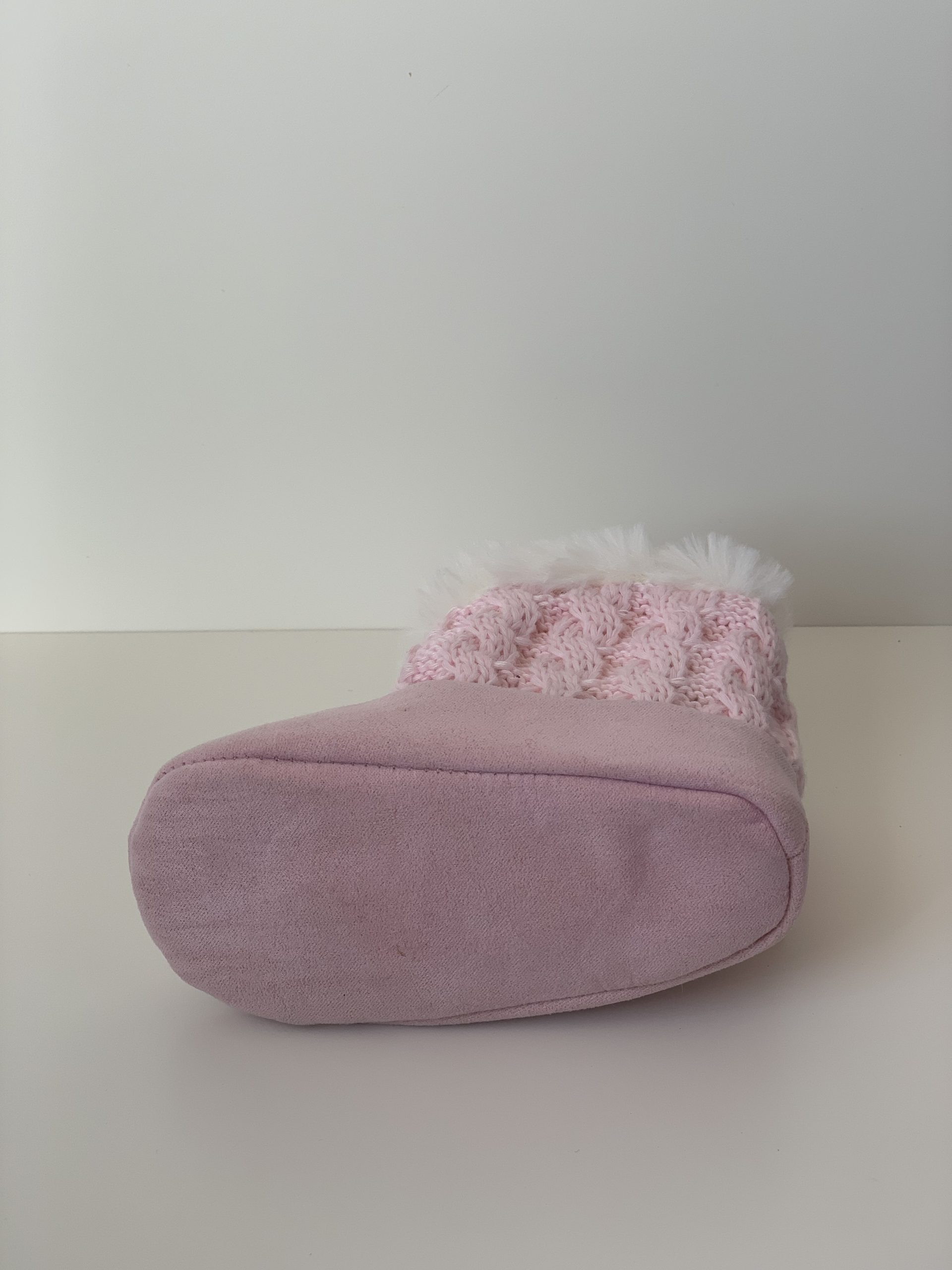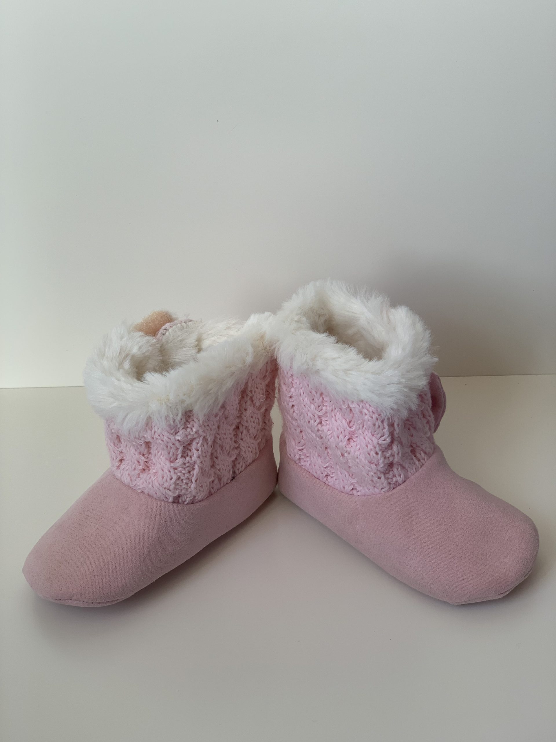Botita para bebes en color rosa combinada con lana, forrada de pelito por dentro y con cierre de velcro adornado con lazo. Van sin suela son muy flexibles, ajustables con el velcro y fáciles de poner. Disponible en dos colores: en rosa y azul marino. Fabricadas por la marca Bubble.