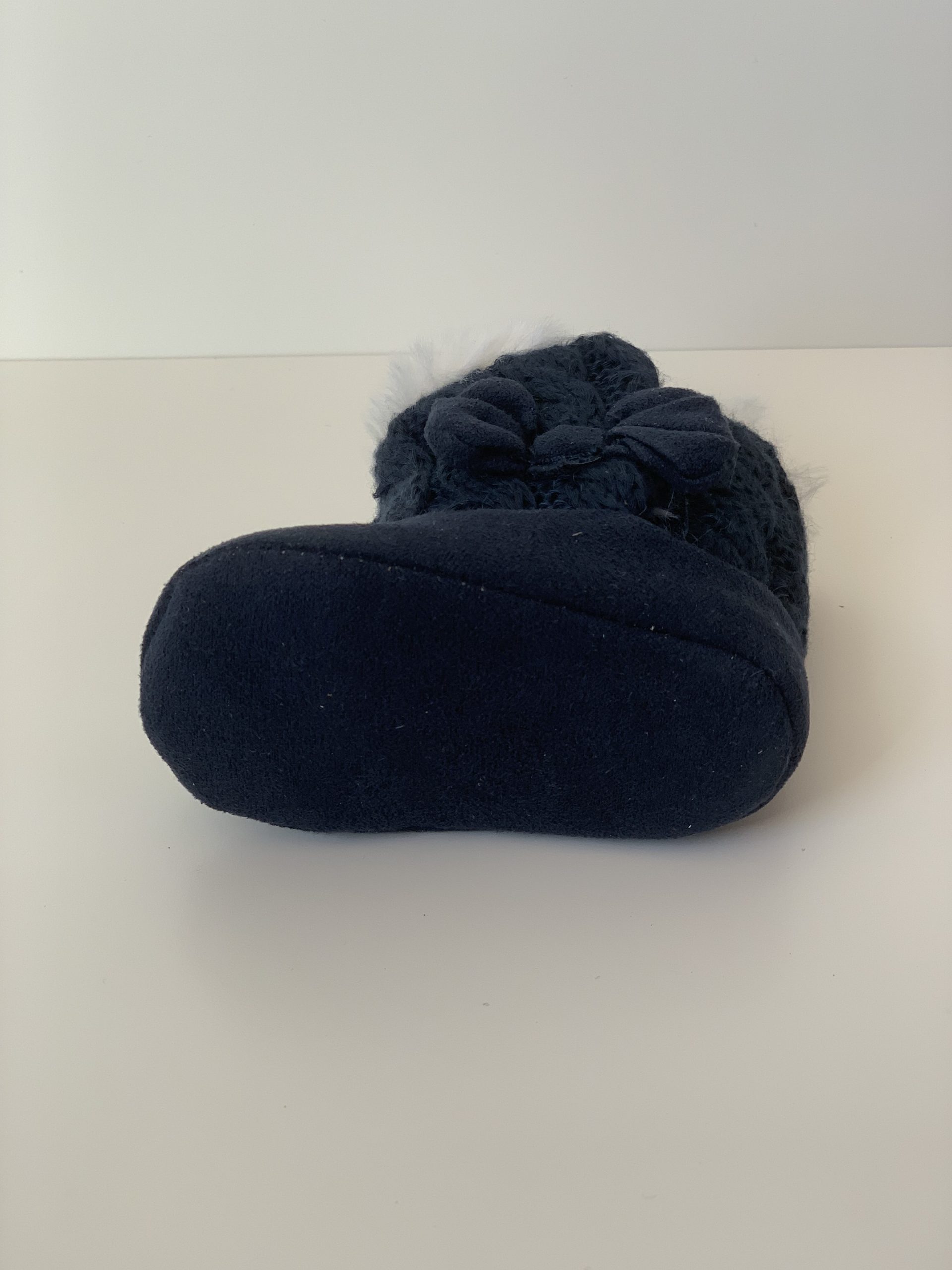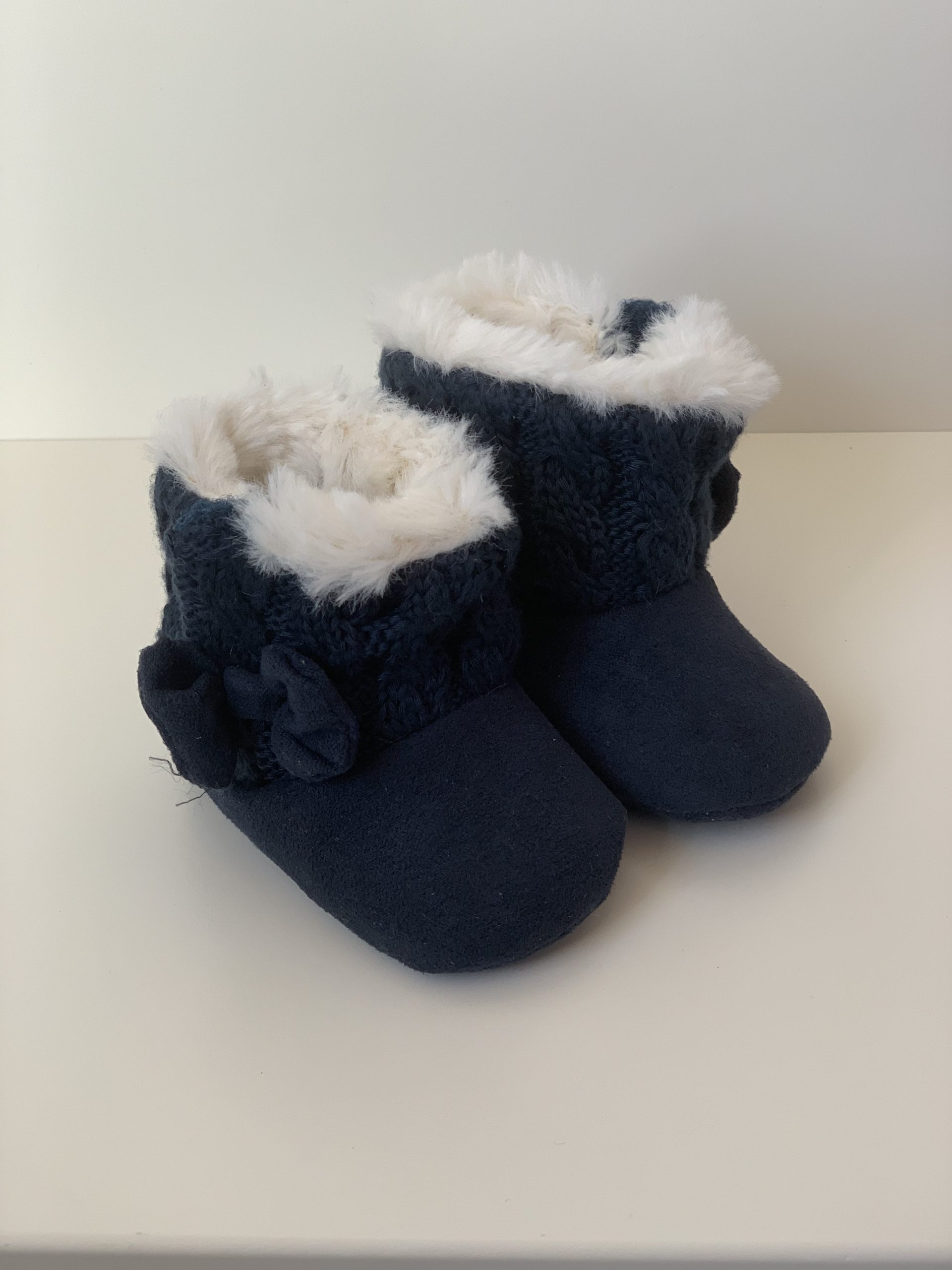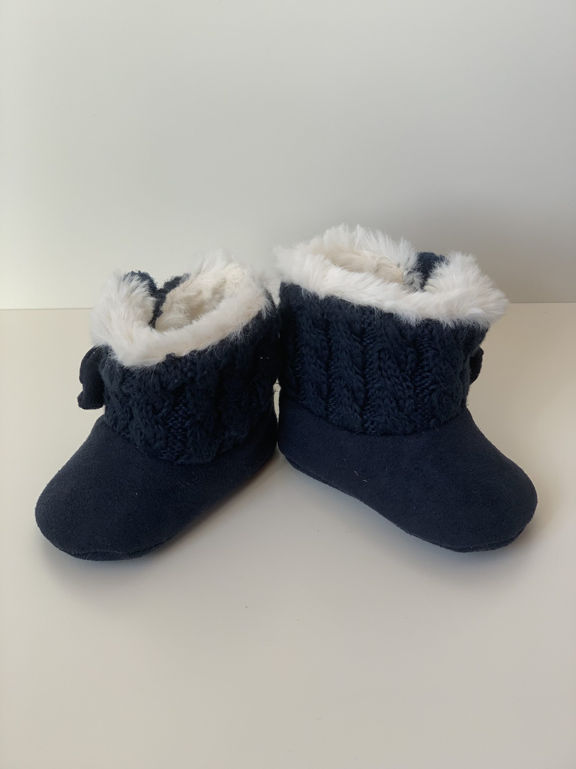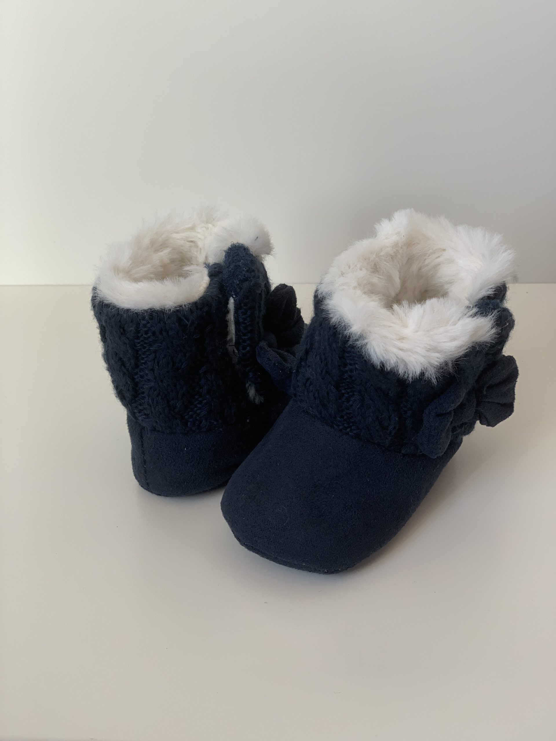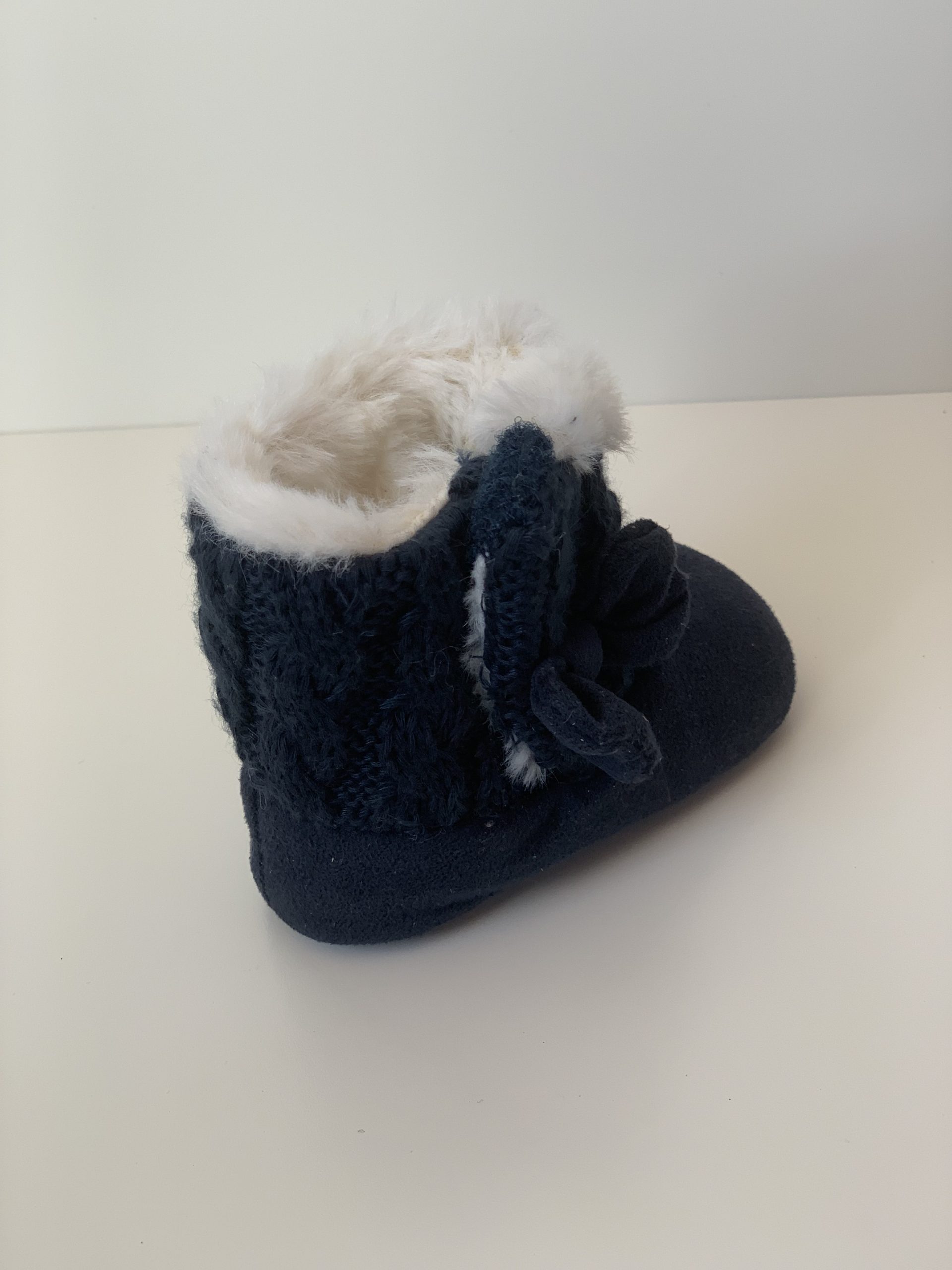 Botita para bebes en color rosa combinada con lana, forrada de pelito por dentro y con cierre de velcro adornado con lazo. Van sin suela son muy flexibles, ajustables con el velcro y fáciles de poner. Disponible en dos colores: en rosa y azul marino. Fabricadas por la marca Bubble.