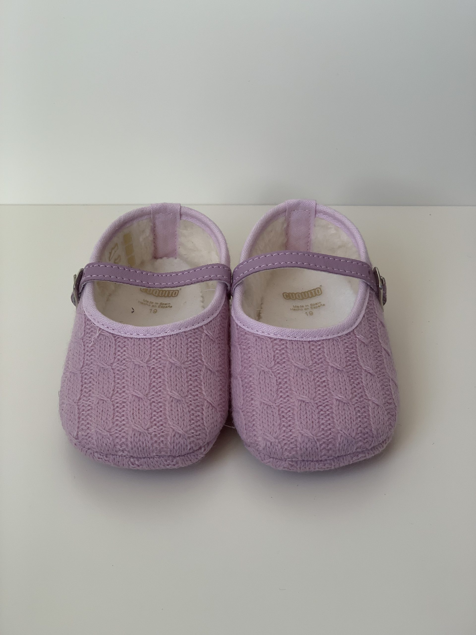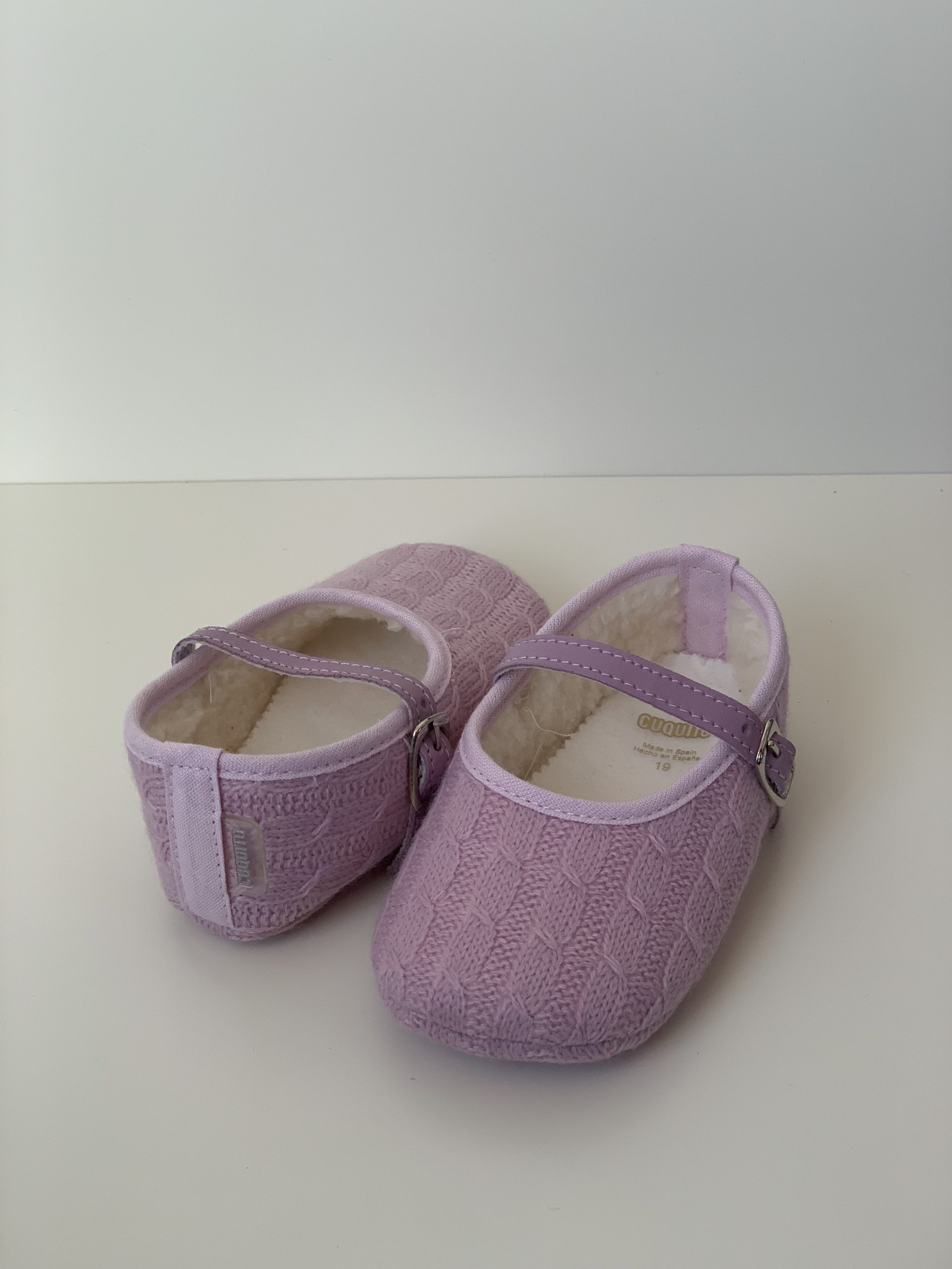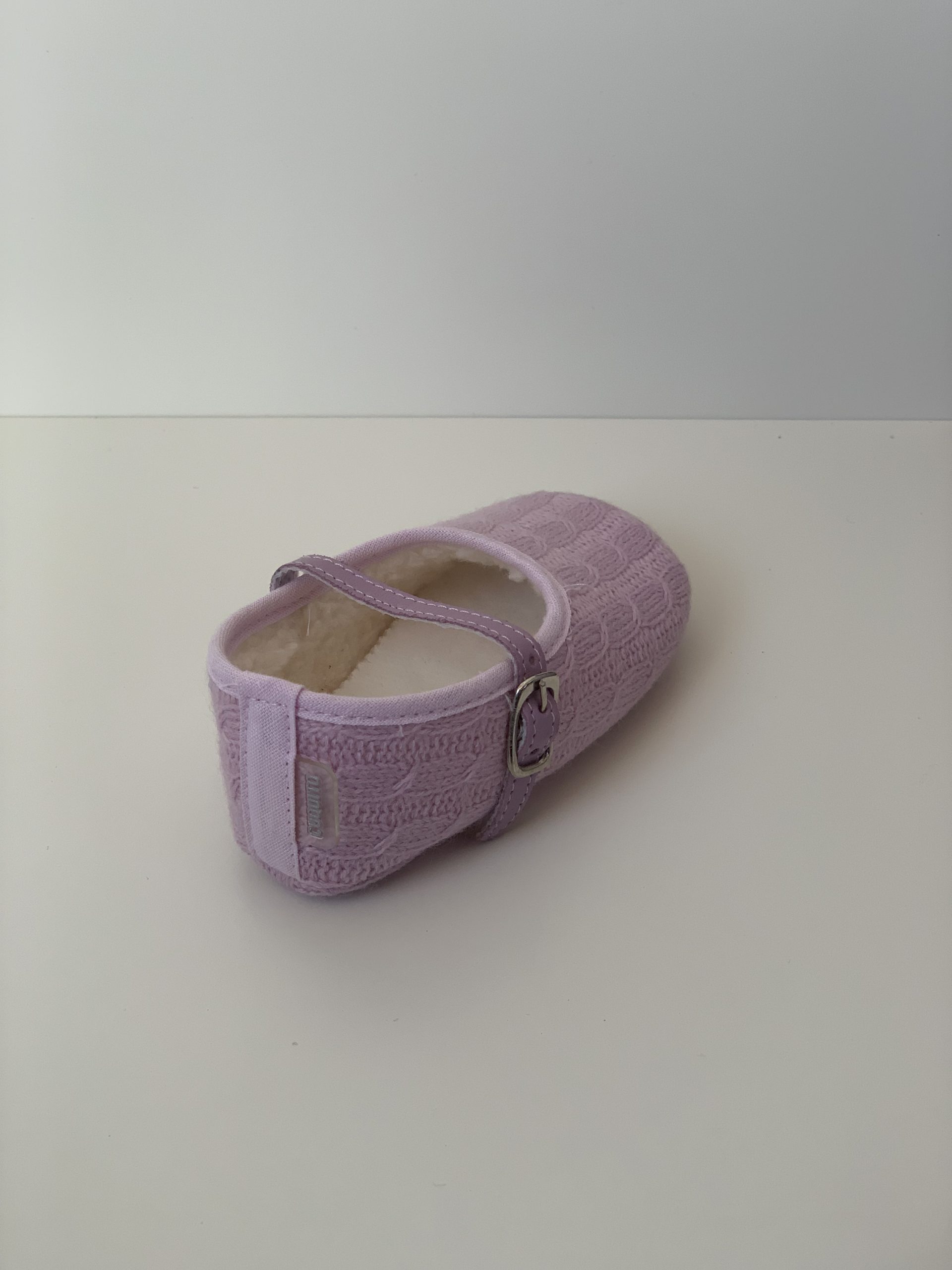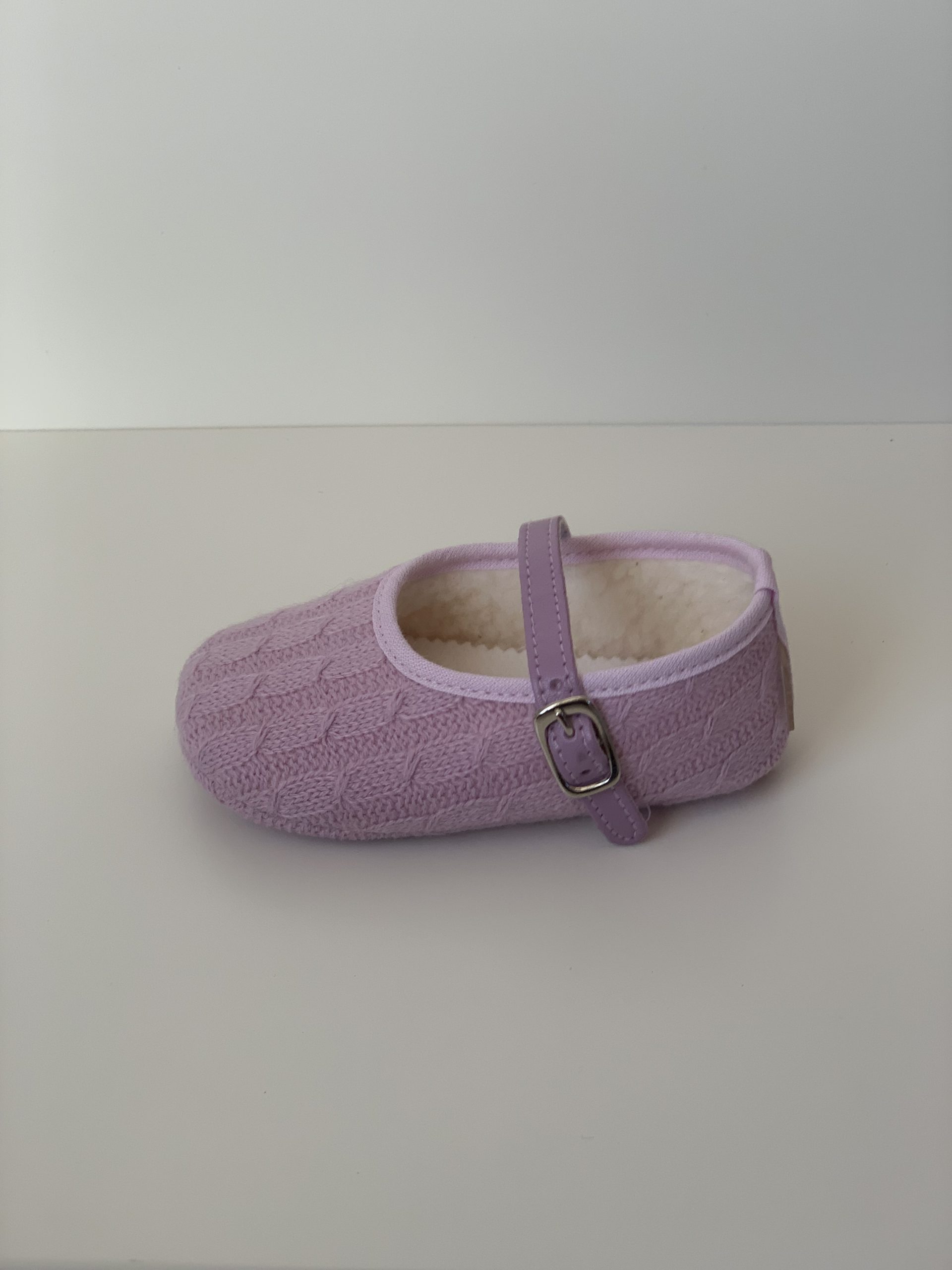 Mercedita en color lila combinada de lana y textil con cierre de hebilla. Esta forradita por dentro de borreguito para tener los pies calentitos. Disponible en color lila y gris. Fabricados en España por la marca Cuquito.