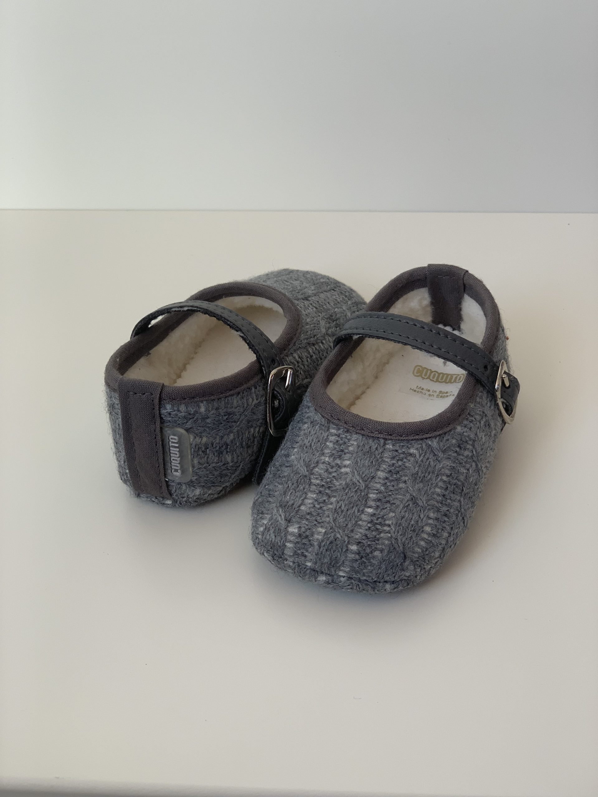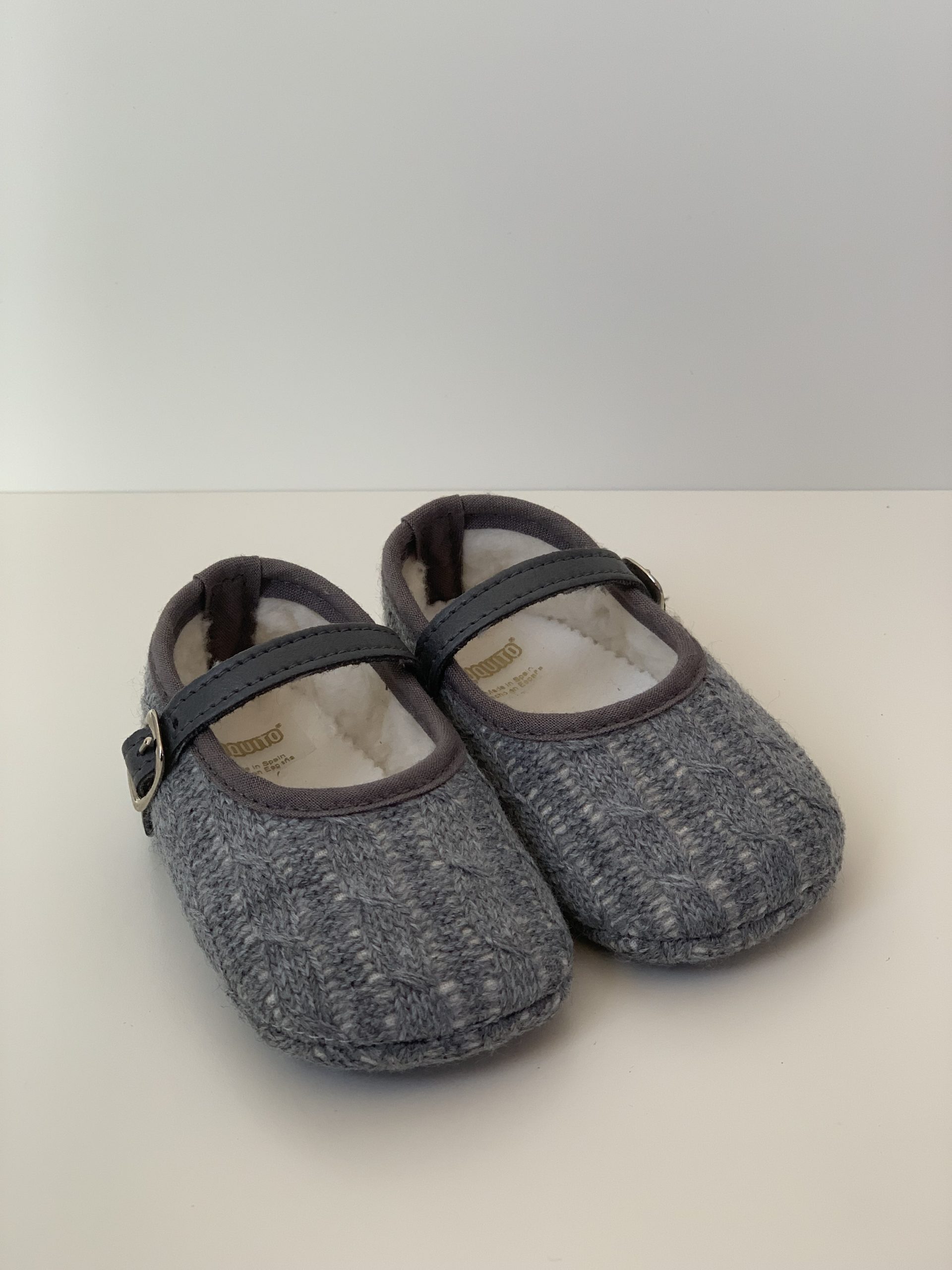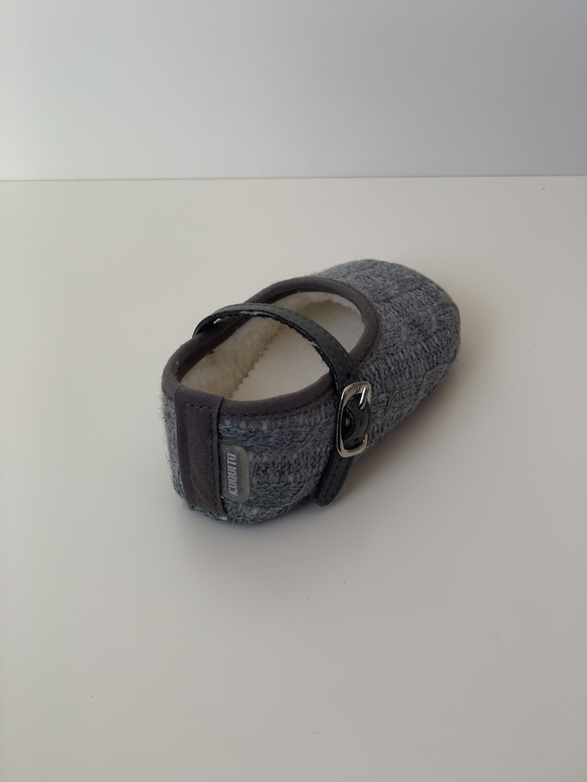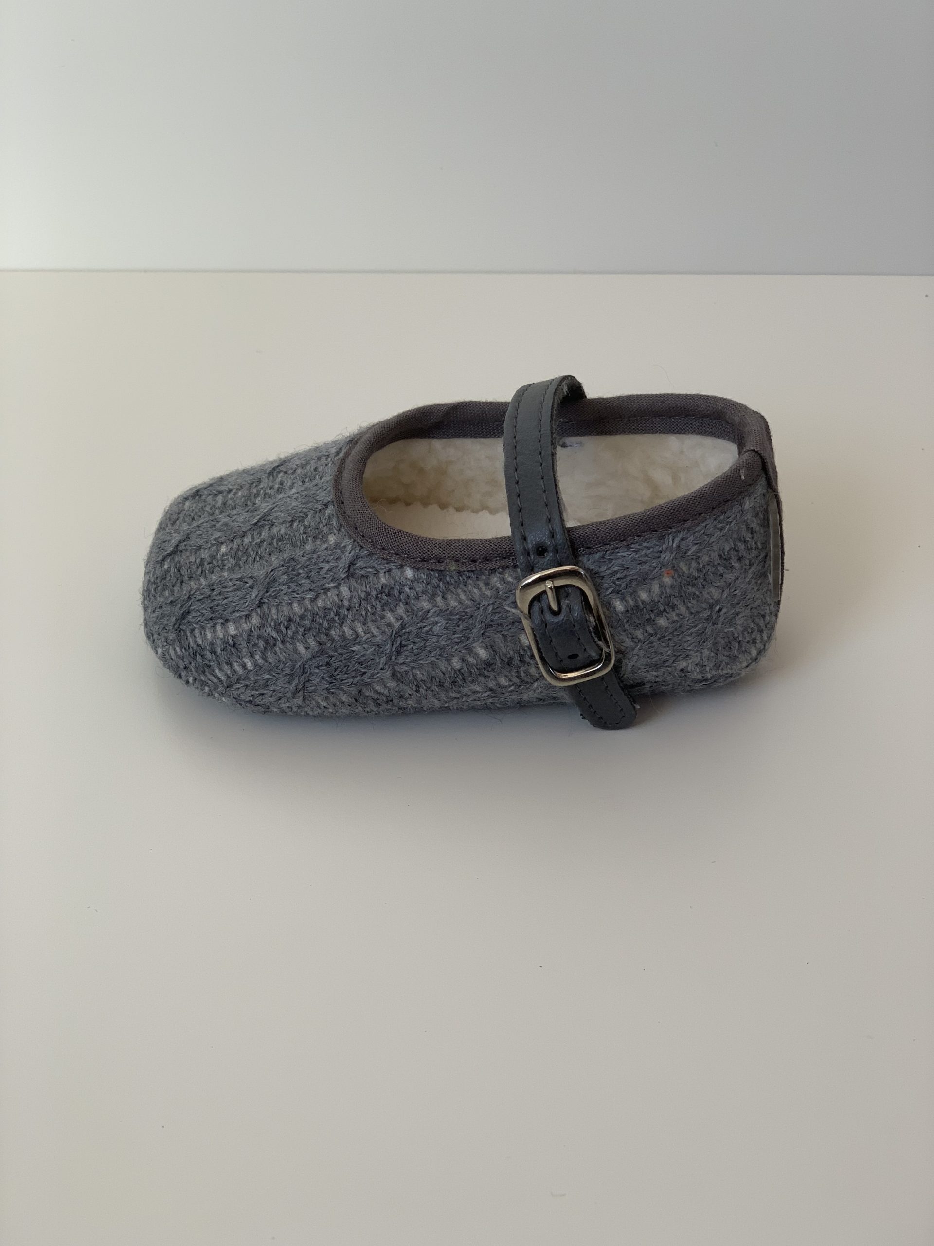 Mercedita en color lila combinada de lana y textil con cierre de hebilla. Esta forradita por dentro de borreguito para tener los pies calentitos. Disponible en color lila y gris. Fabricados en España por la marca Cuquito.