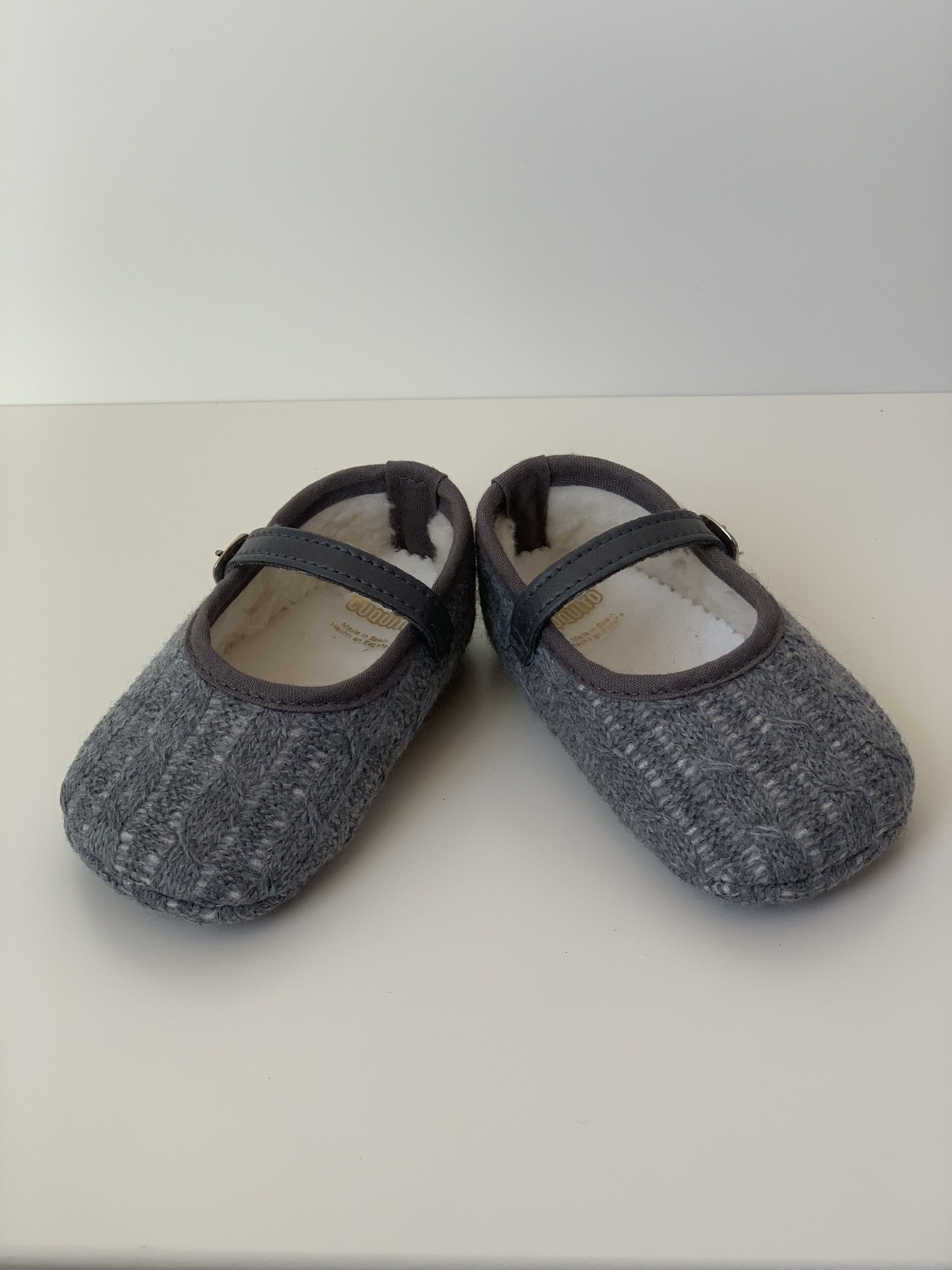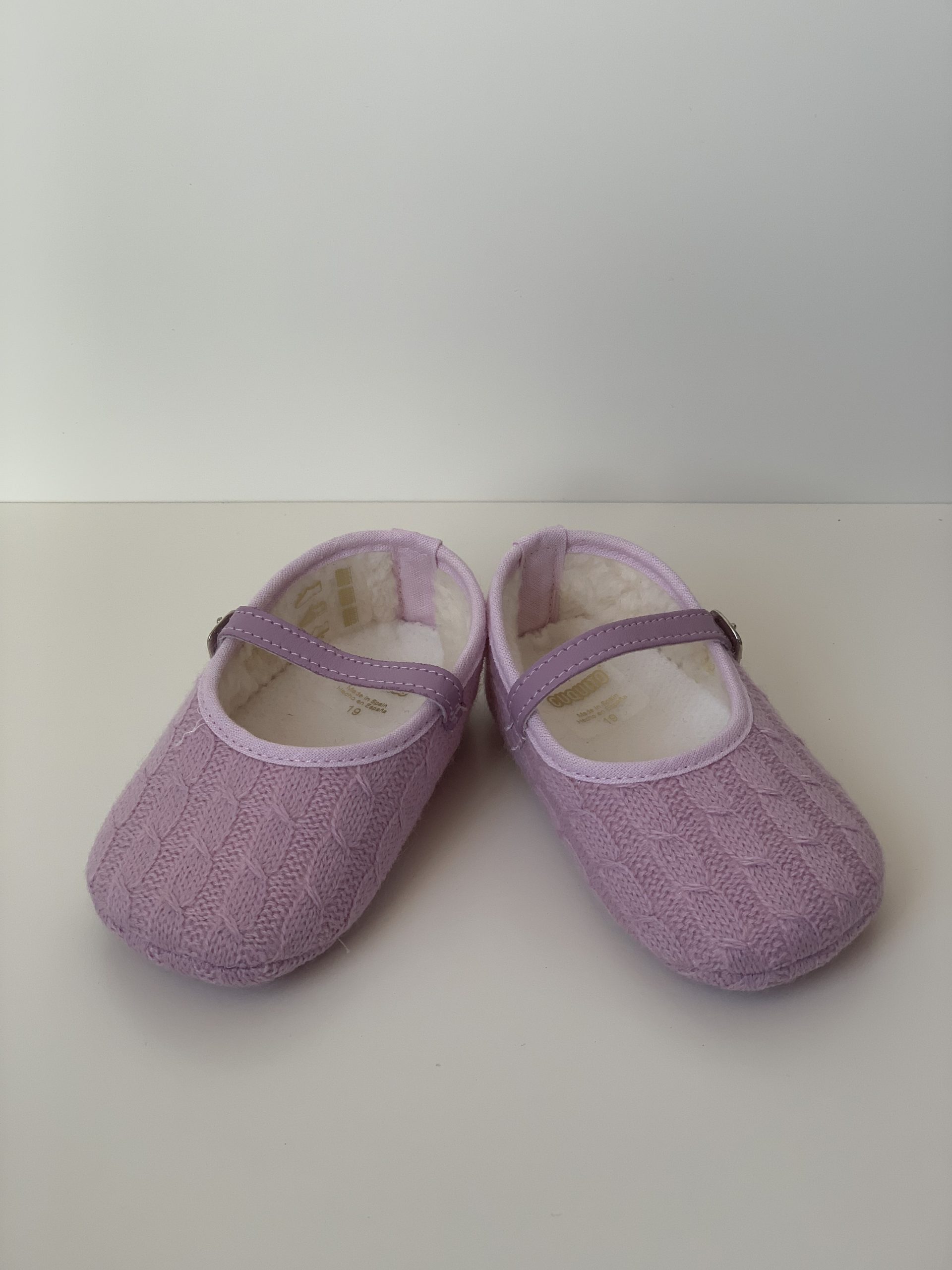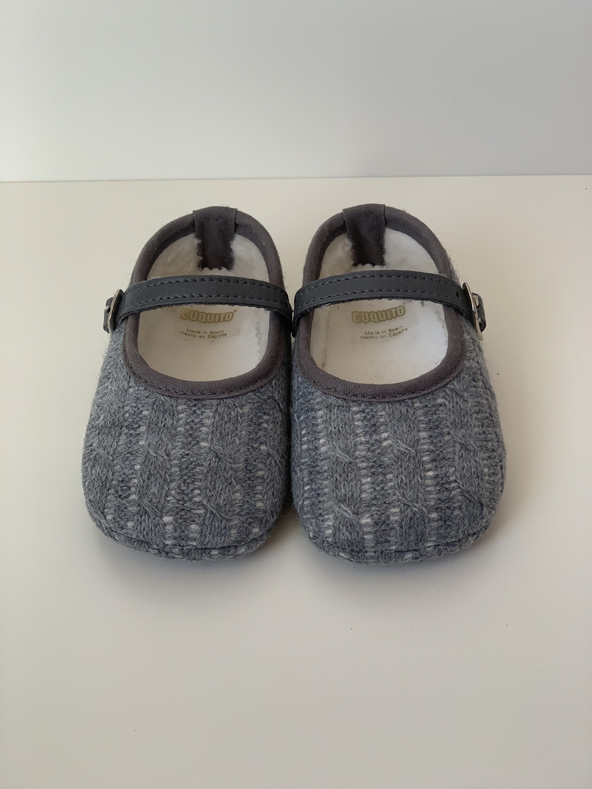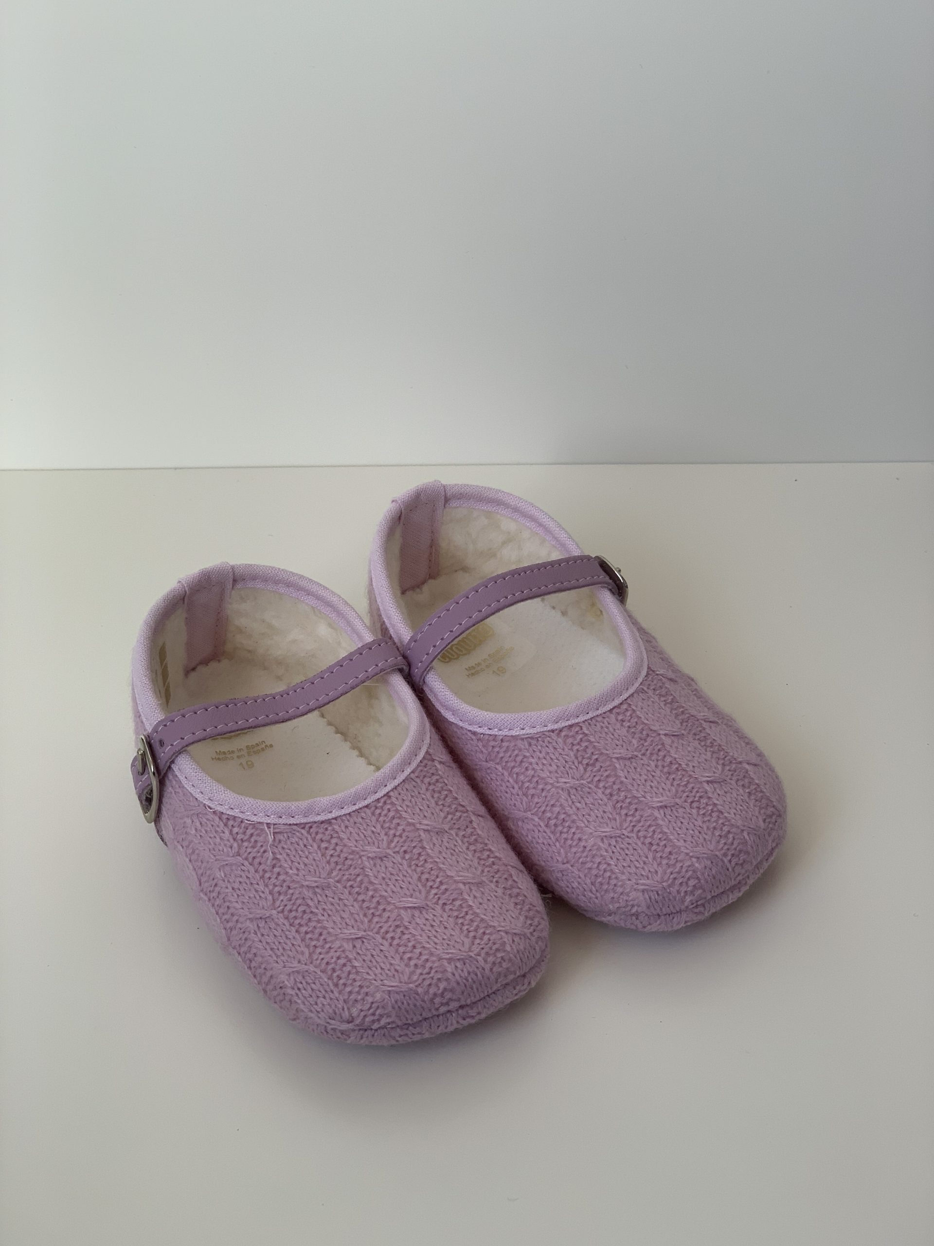 Mercedita en color lila combinada de lana y textil con cierre de hebilla. Esta forradita por dentro de borreguito para tener los pies calentitos. Disponible en color lila y gris. Fabricados en España por la marca Cuquito.