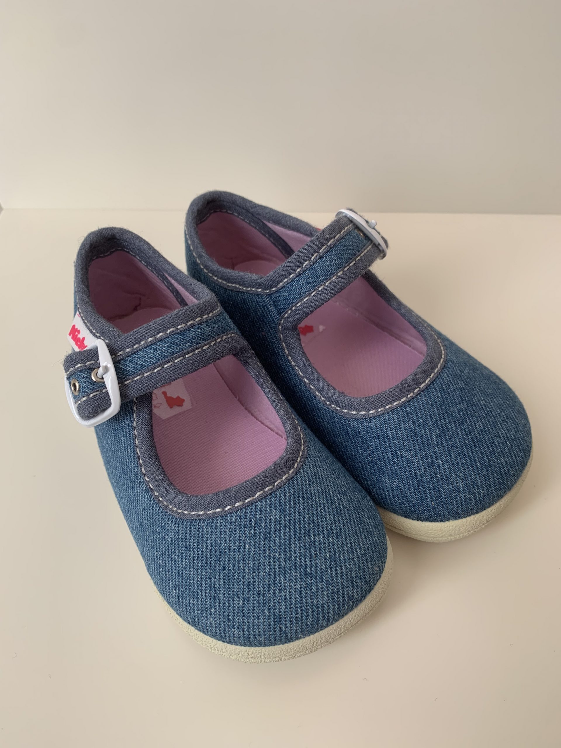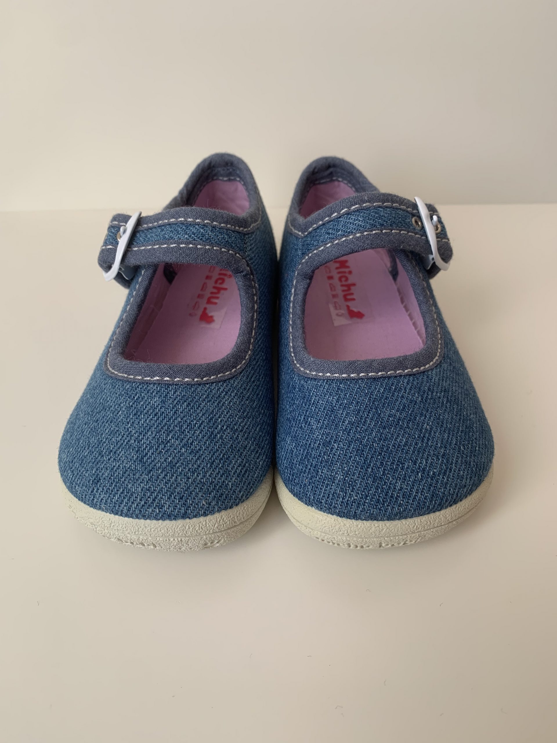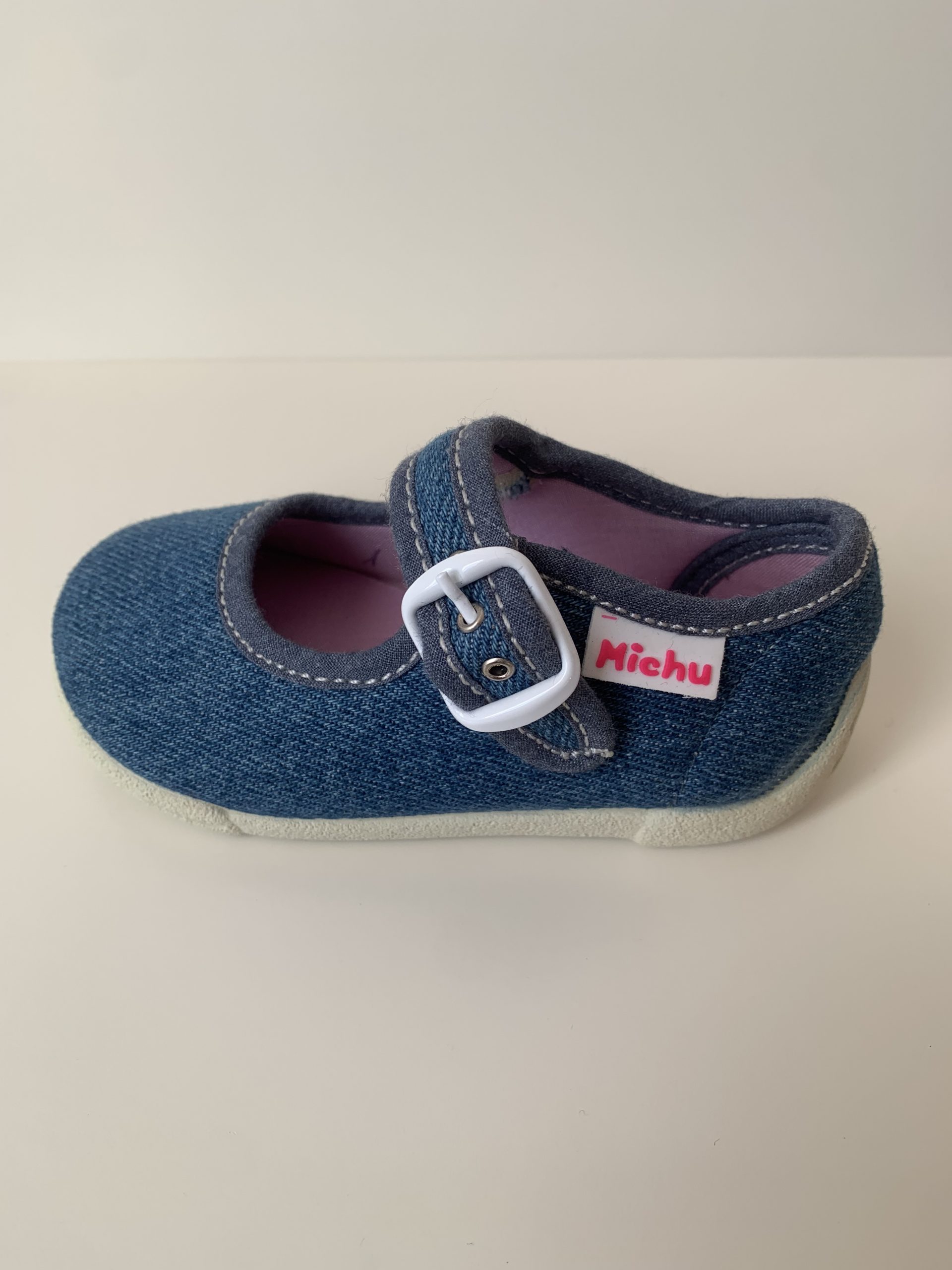 Mercedita acolchada de lona color tejano, con cierre de hebilla y fijación de piso vulcanizada; son muy flexibles y confortables, además se ajustan perfectamente al pie, gracias a su plantilla acolchada. Hechas en España por Shoes Michu.