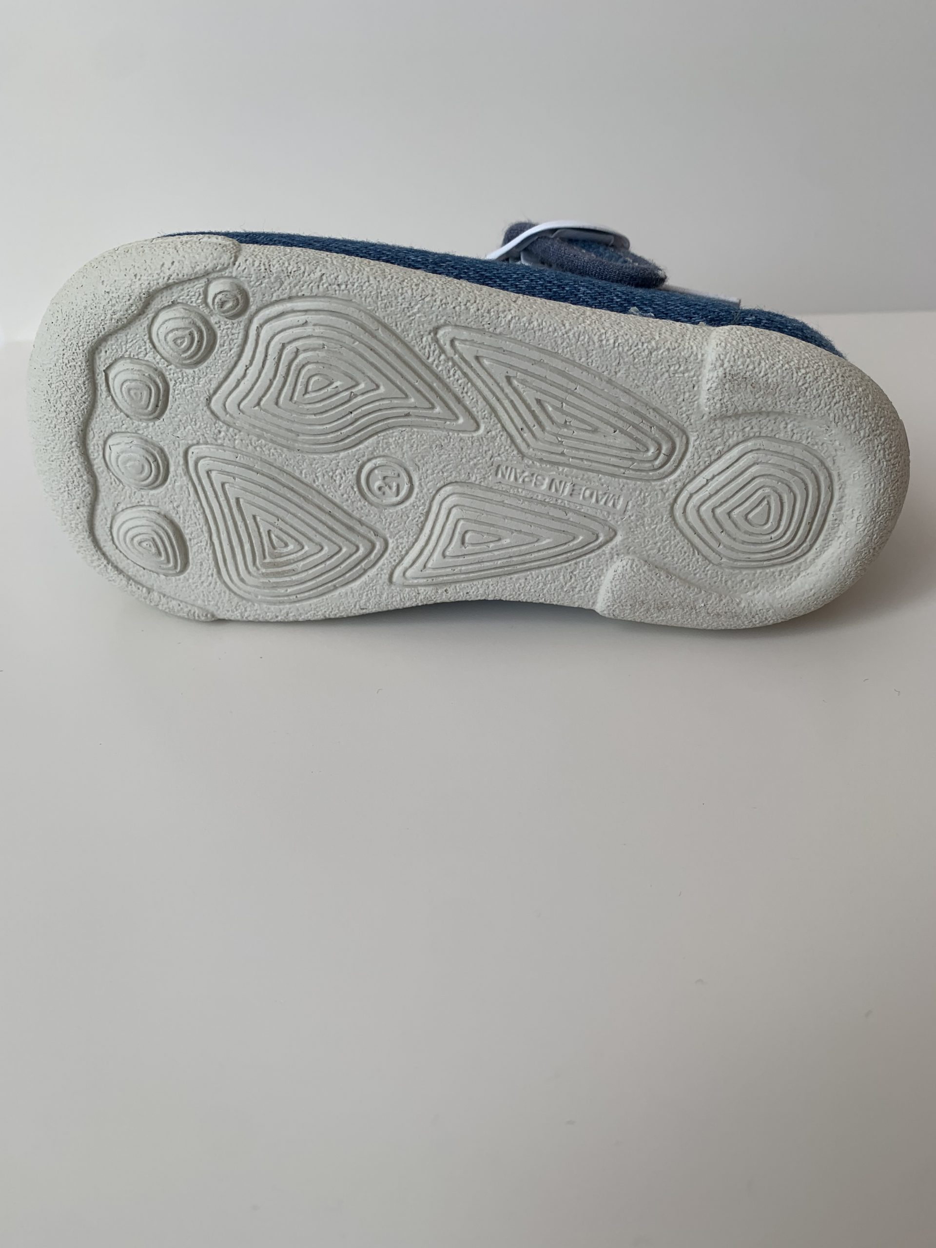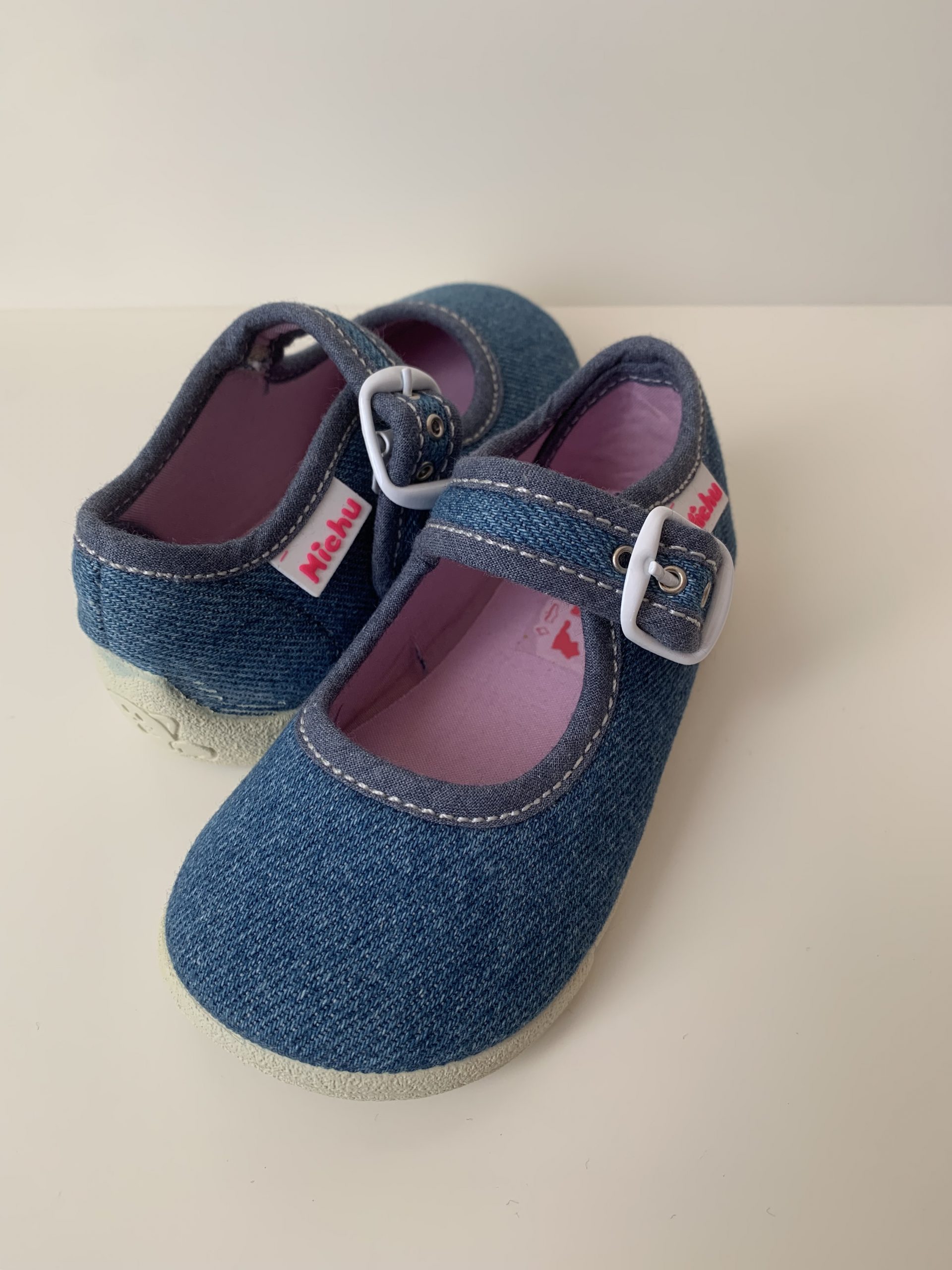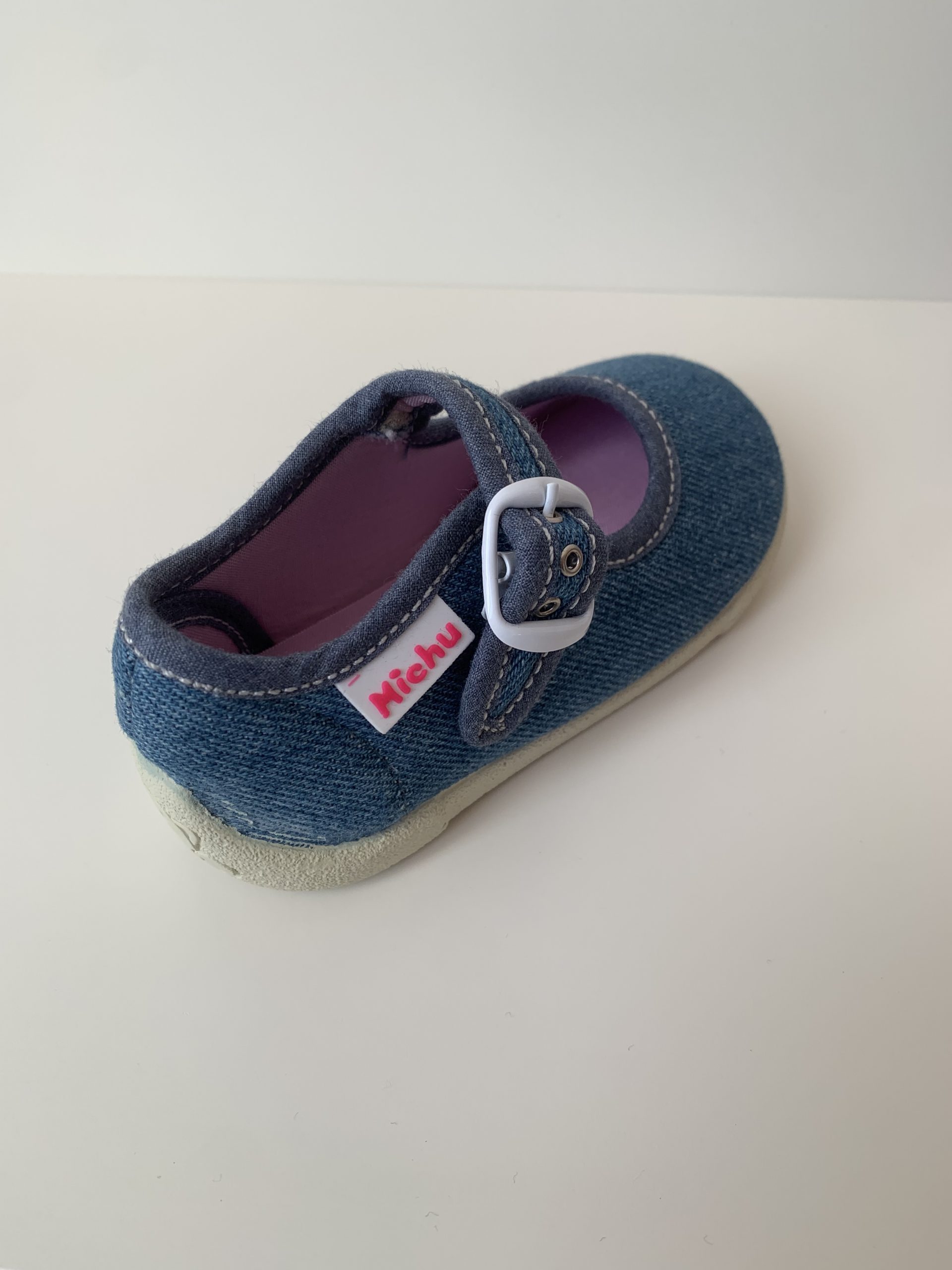 Mercedita acolchada de lona color tejano, con cierre de hebilla y fijación de piso vulcanizada; son muy flexibles y confortables, además se ajustan perfectamente al pie, gracias a su plantilla acolchada. Hechas en España por Shoes Michu.