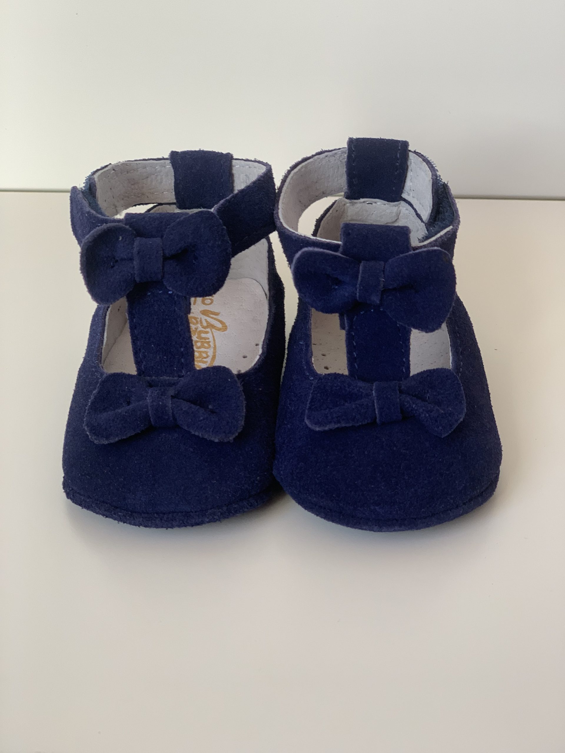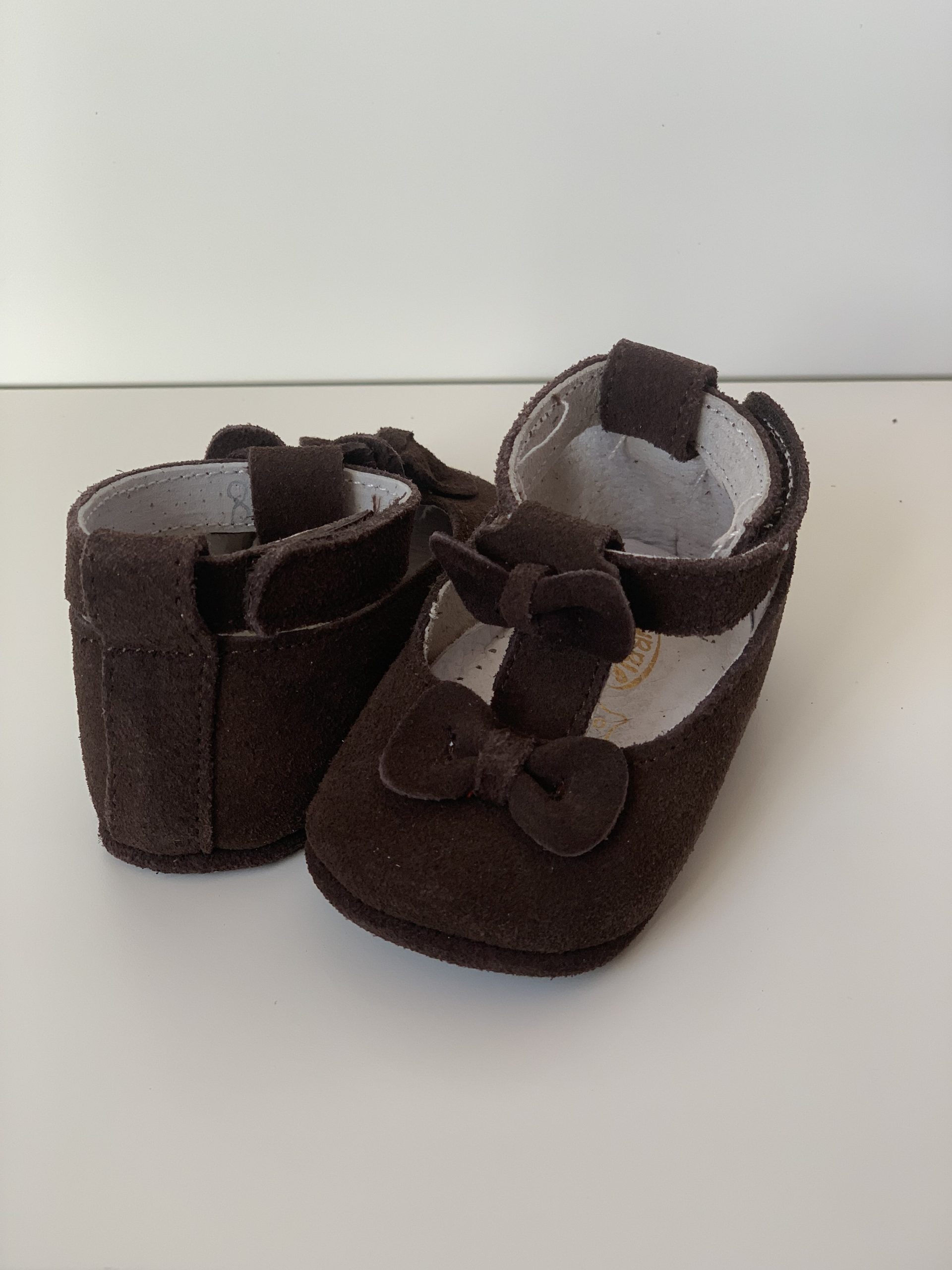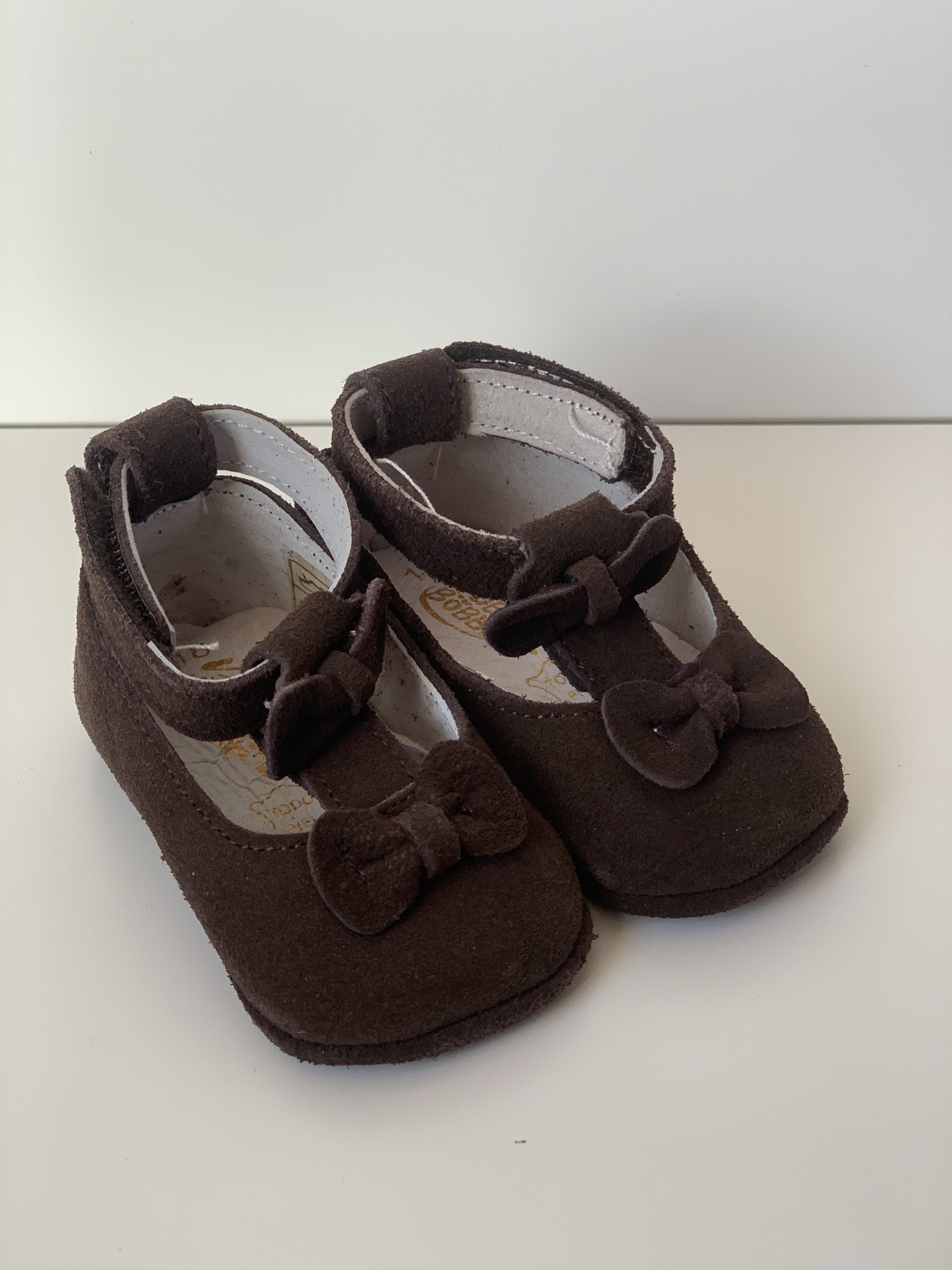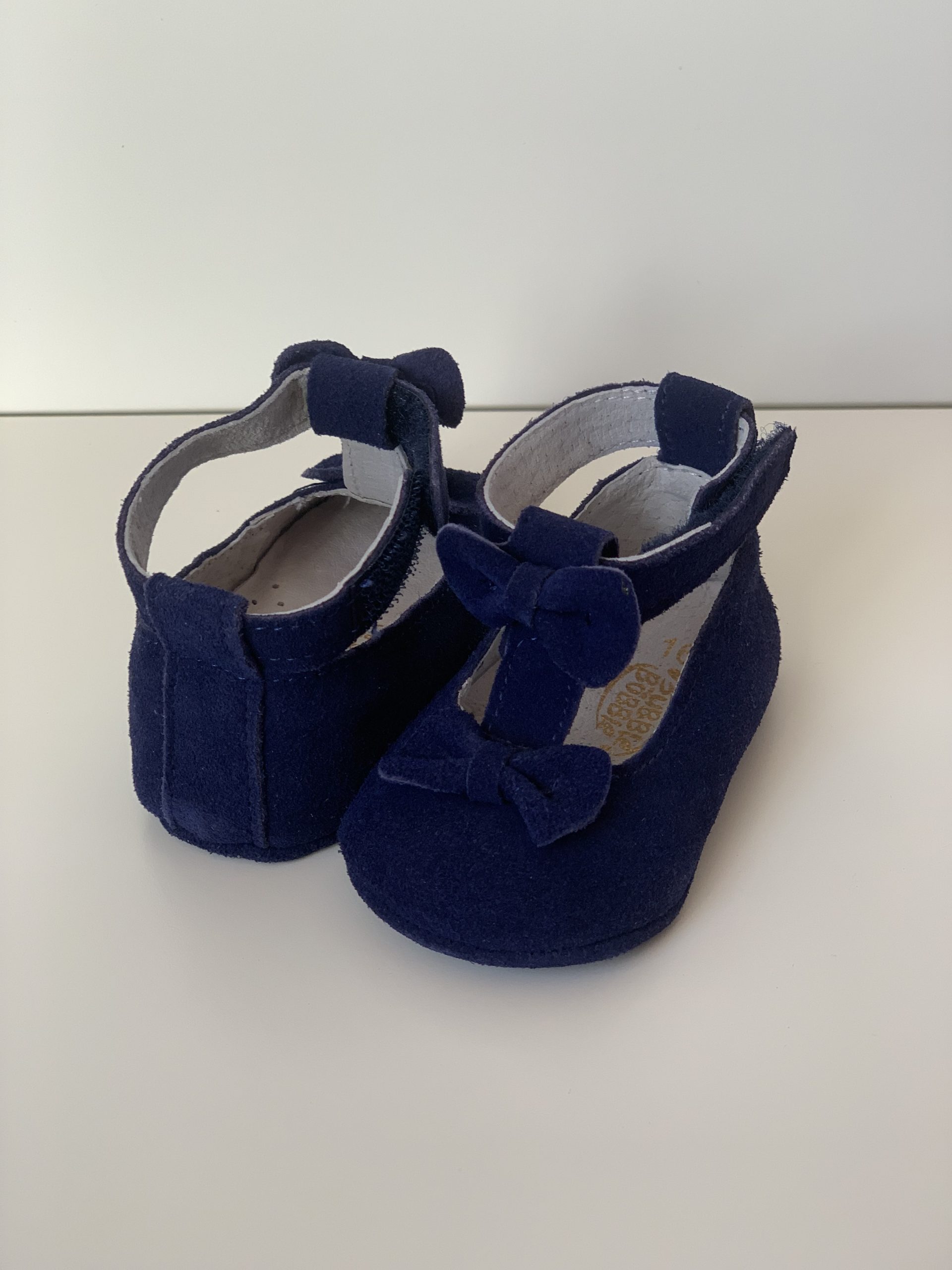 Mercedita en serraje color marrón con cierre con velcro y adornadas con dos lazos. Son cómodas, flexibles y muy fáciles de poner. Disponible en dos colores en marrón y azul. Hechas por la marca Buble.