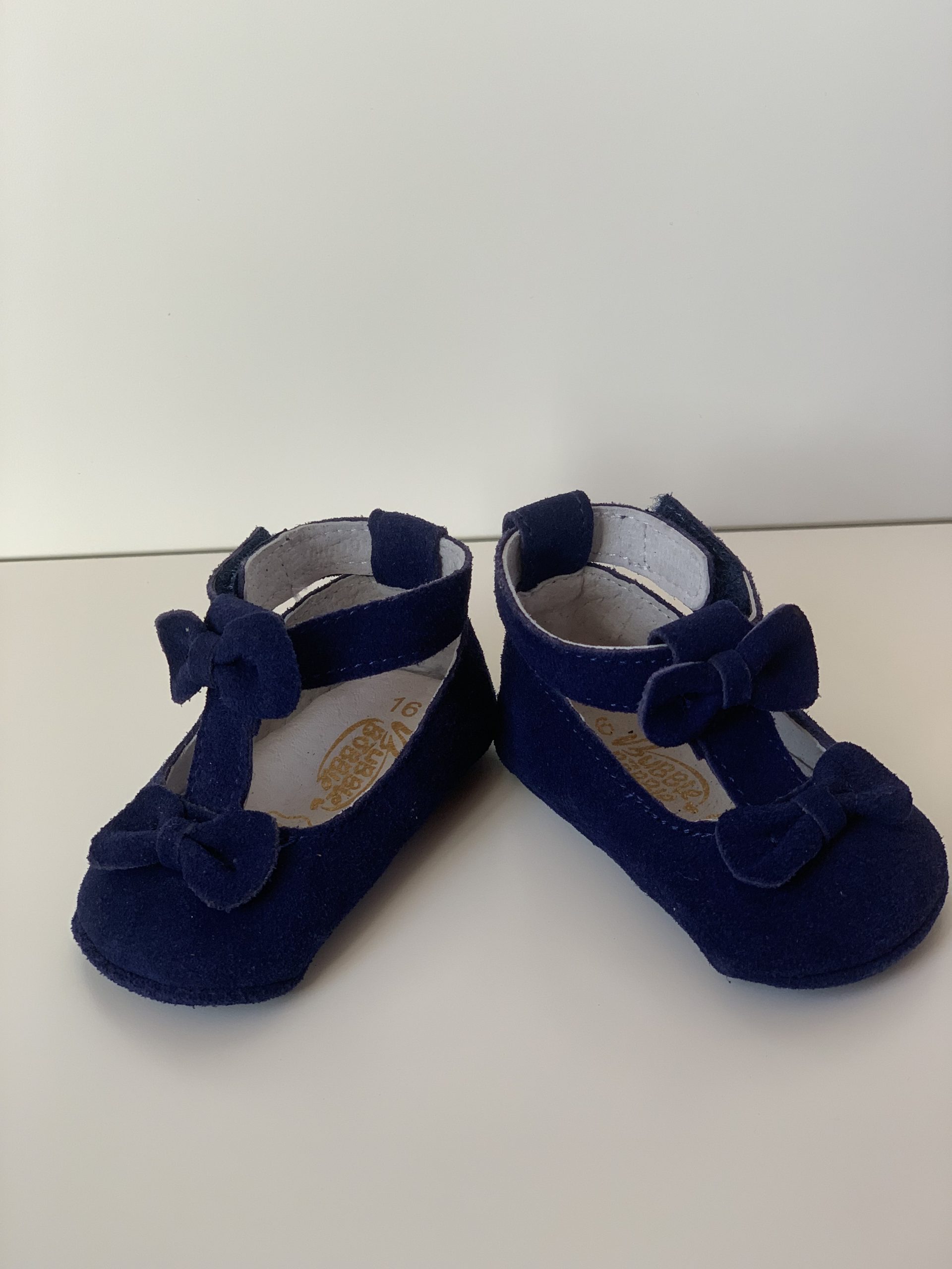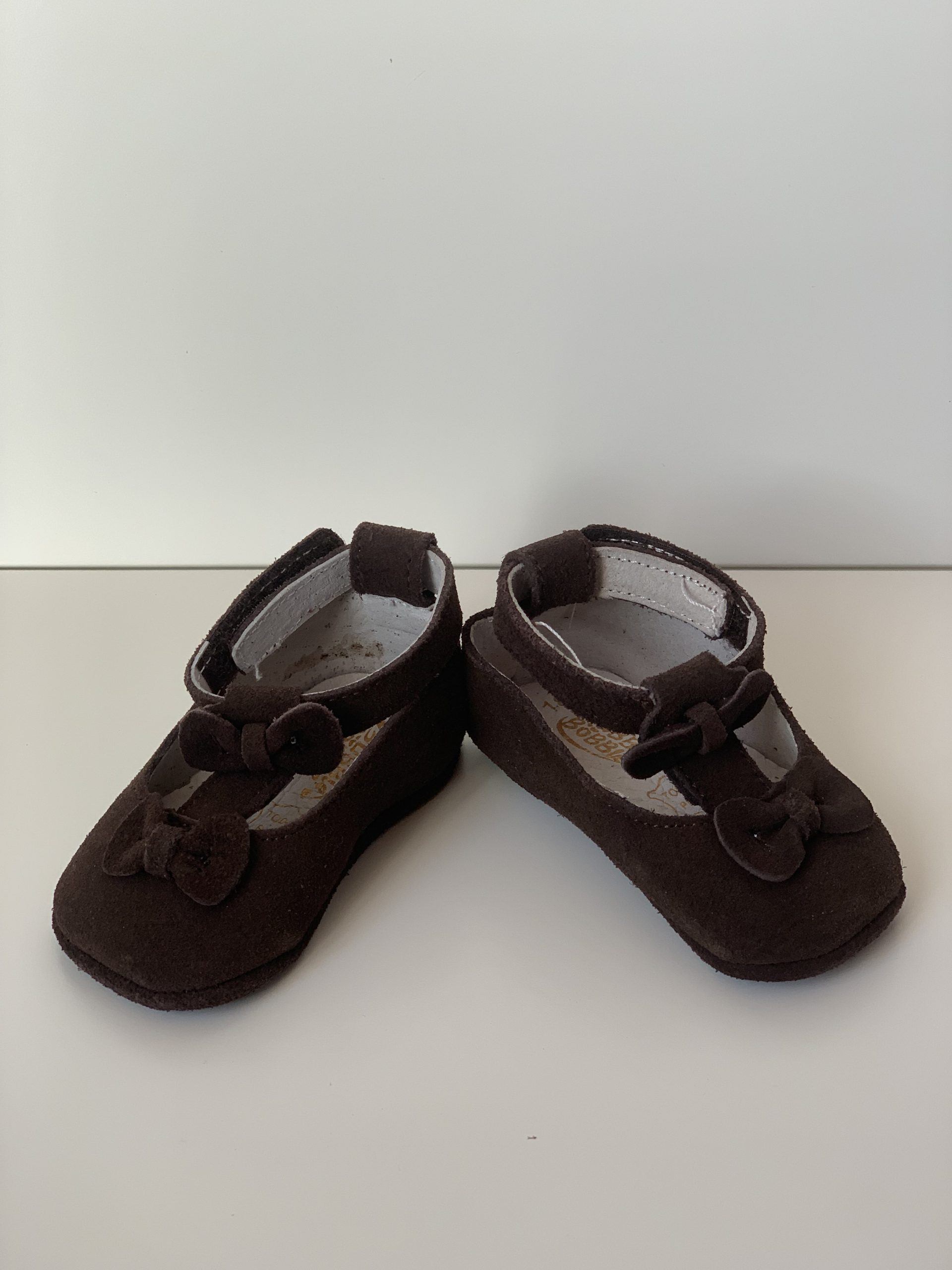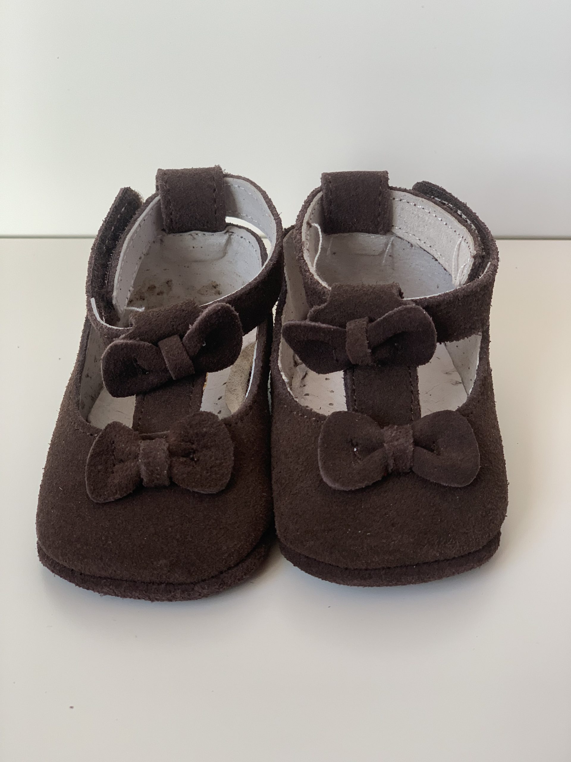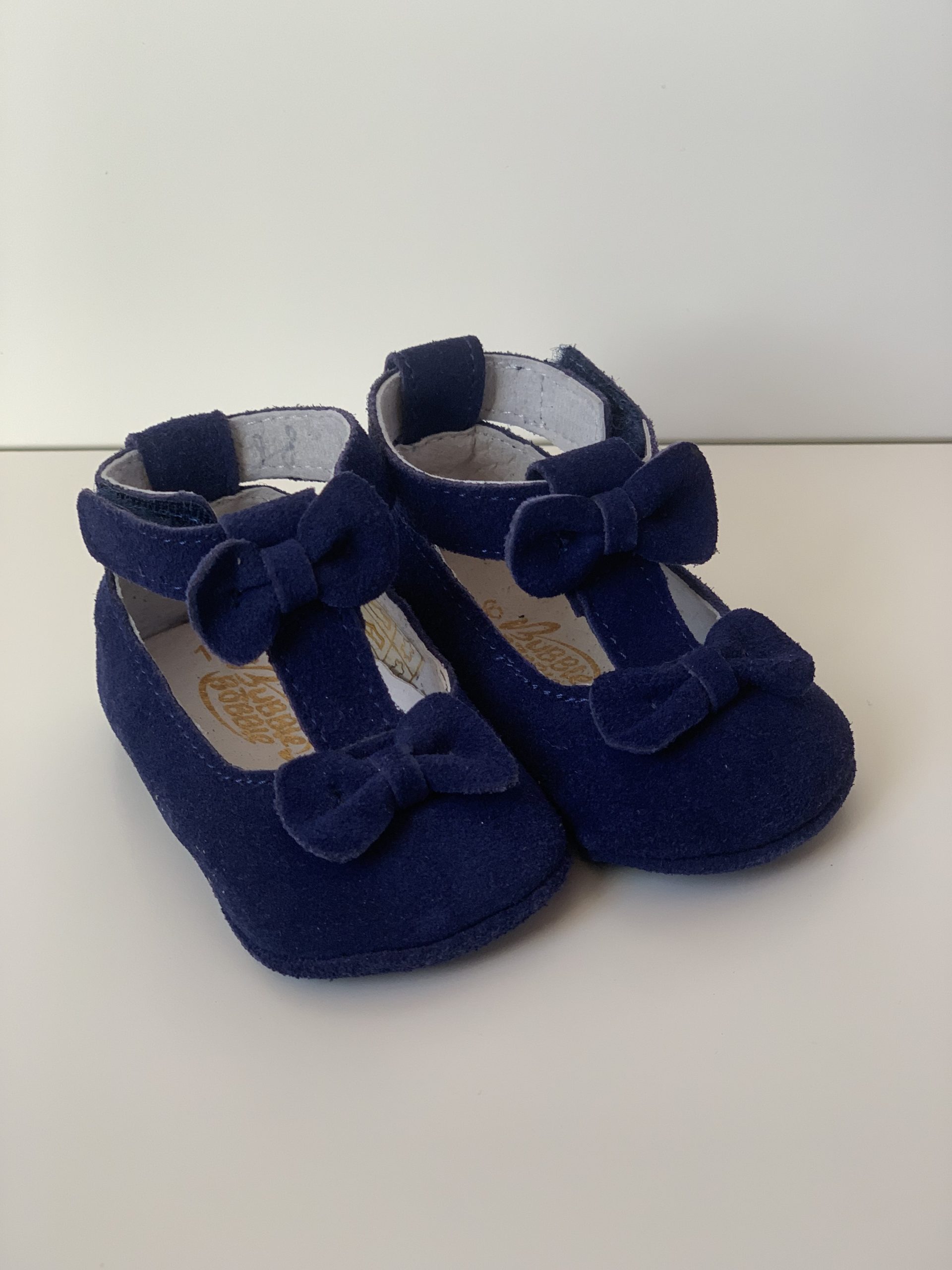Mercedita en serraje color marrón con cierre con velcro y adornadas con dos lazos. Son cómodas, flexibles y muy fáciles de poner. Disponible en dos colores en marrón y azul. Hechas por la marca Buble.