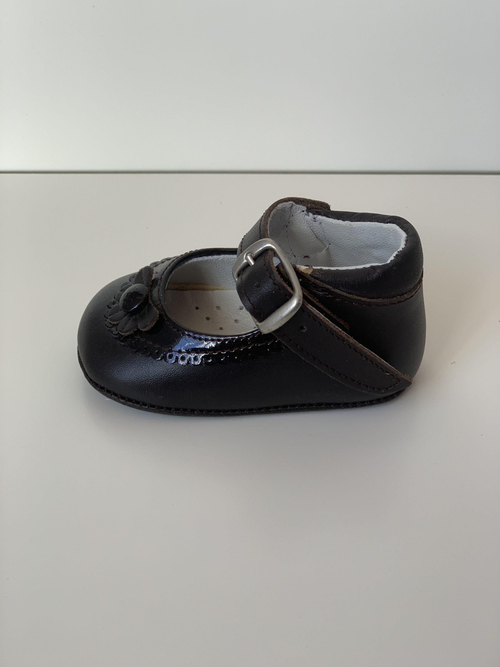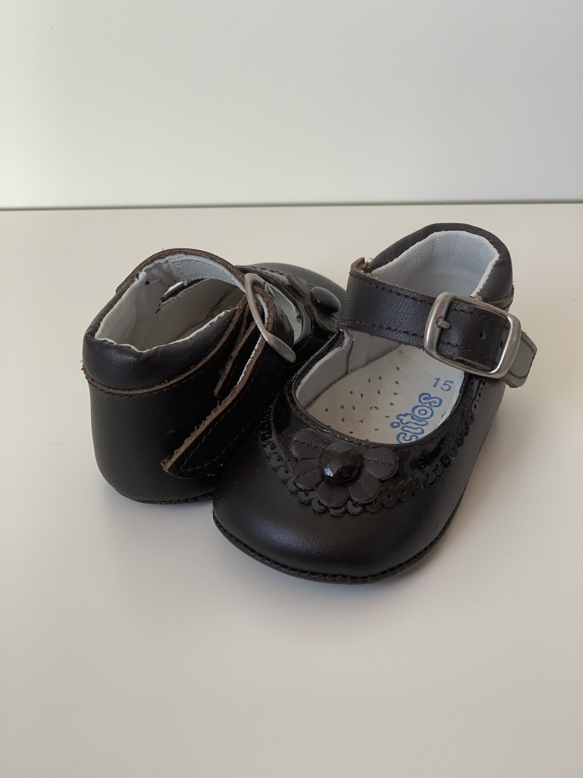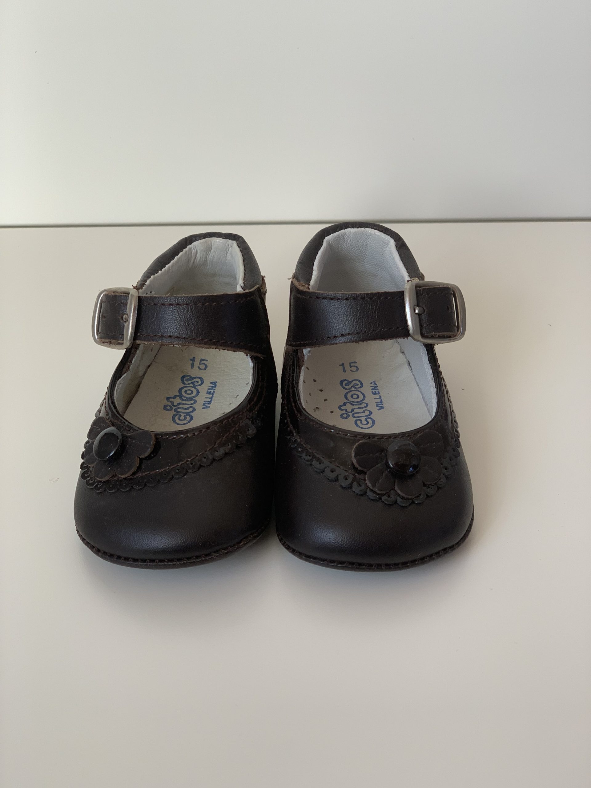 Merceditas con talonera alta en color marrón decorada con ondas y flor en la parte delantera con cierre de hebilla. Fabricadas en España por la marca Citos.
