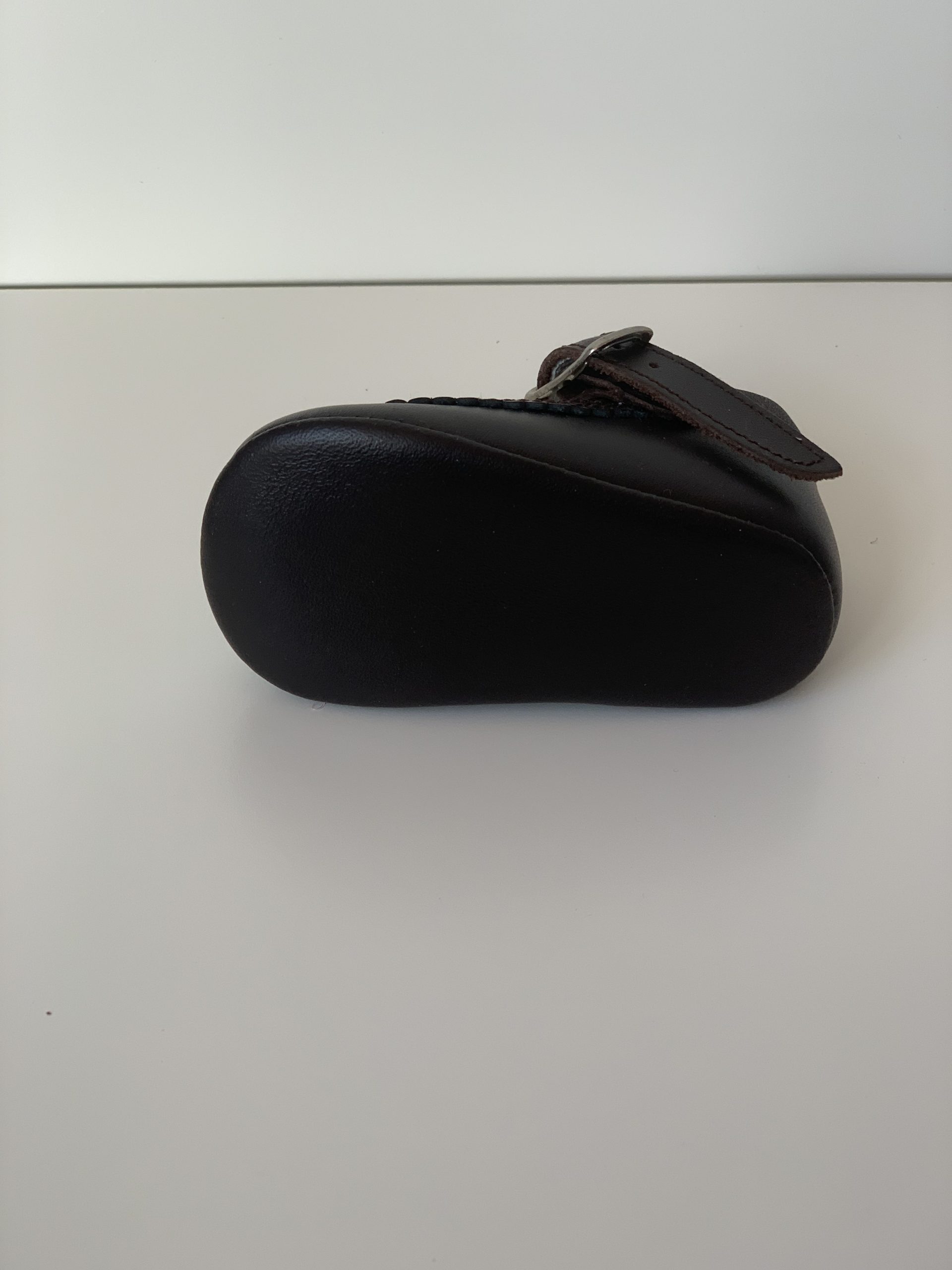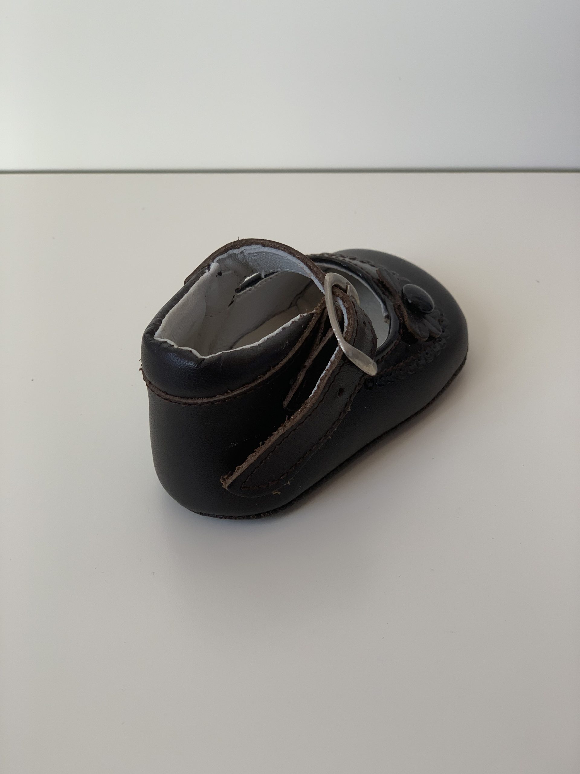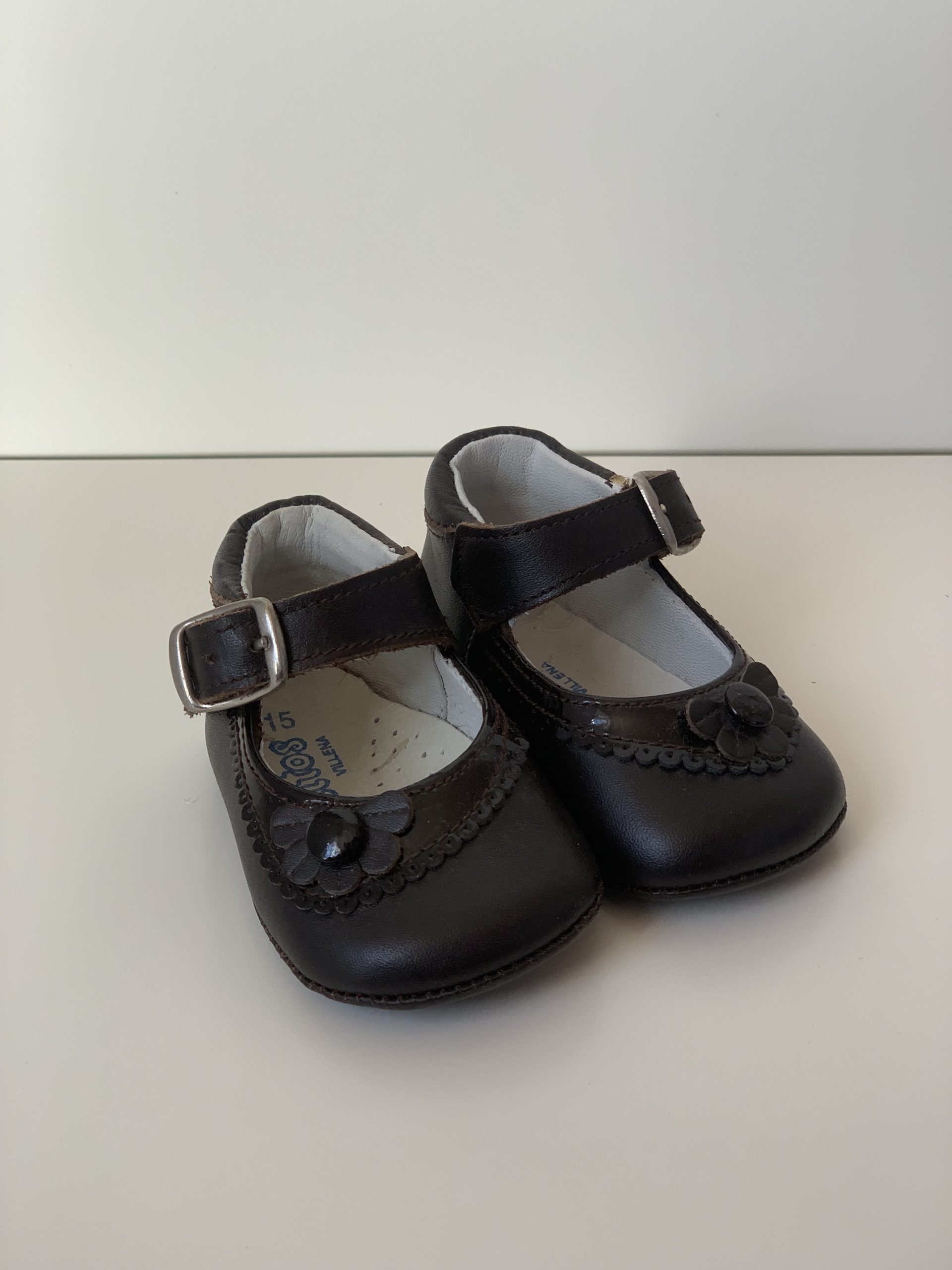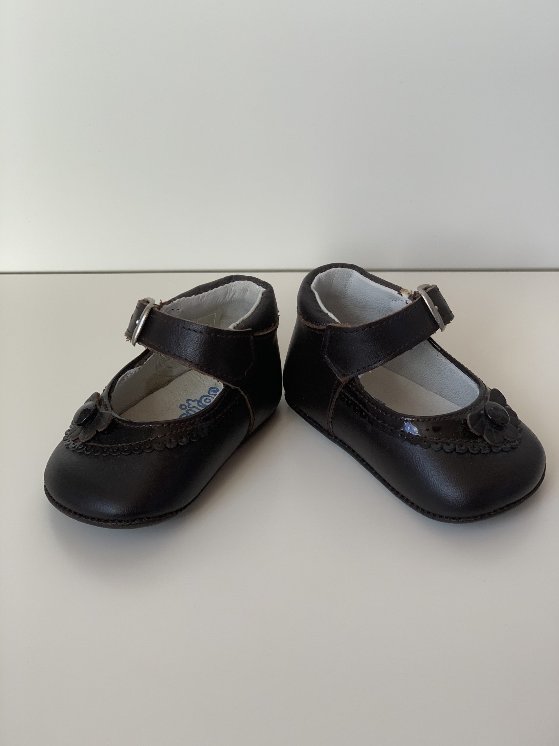 Merceditas con talonera alta en color marrón decorada con ondas y flor en la parte delantera con cierre de hebilla. Fabricadas en España por la marca Citos.