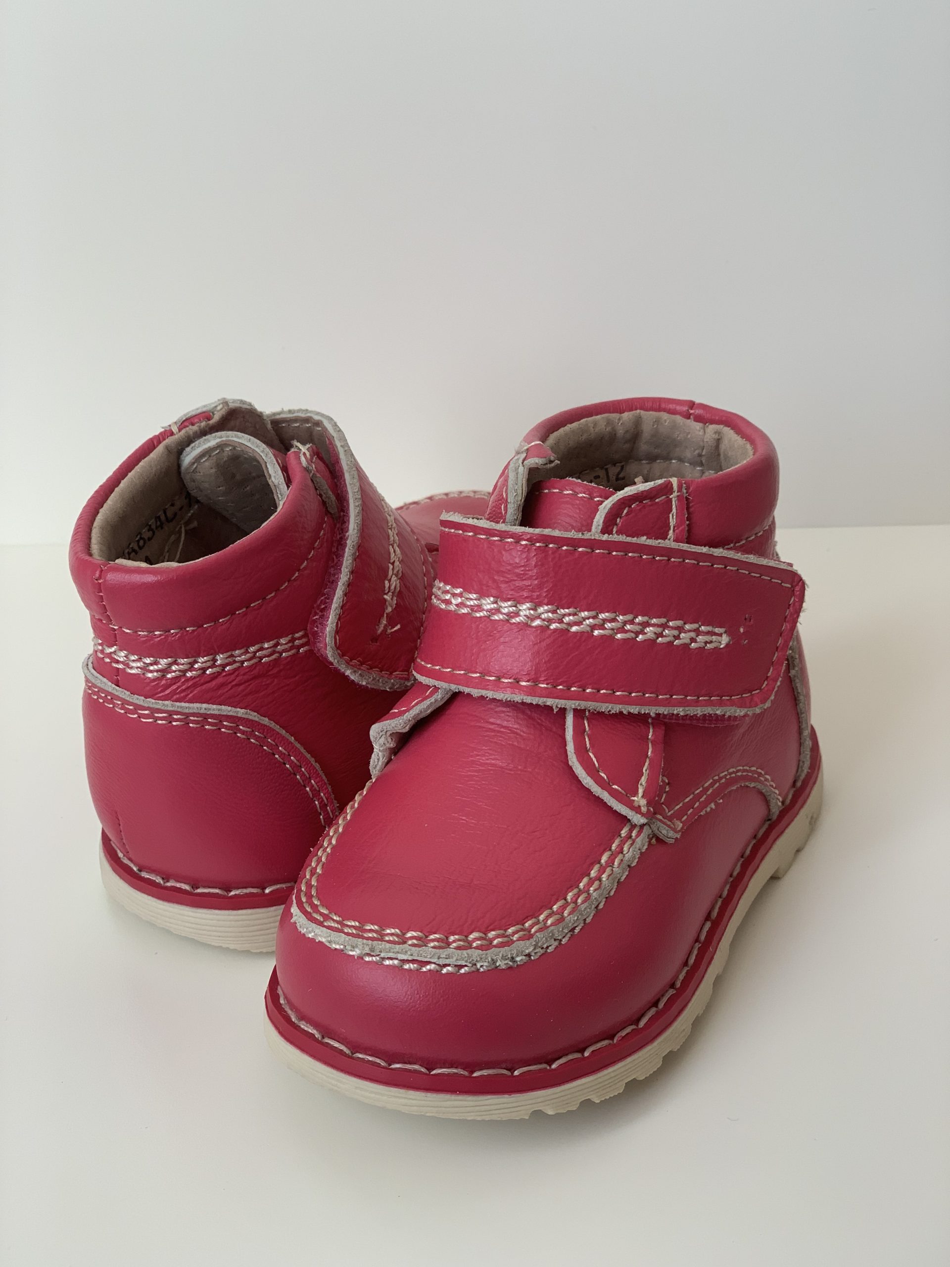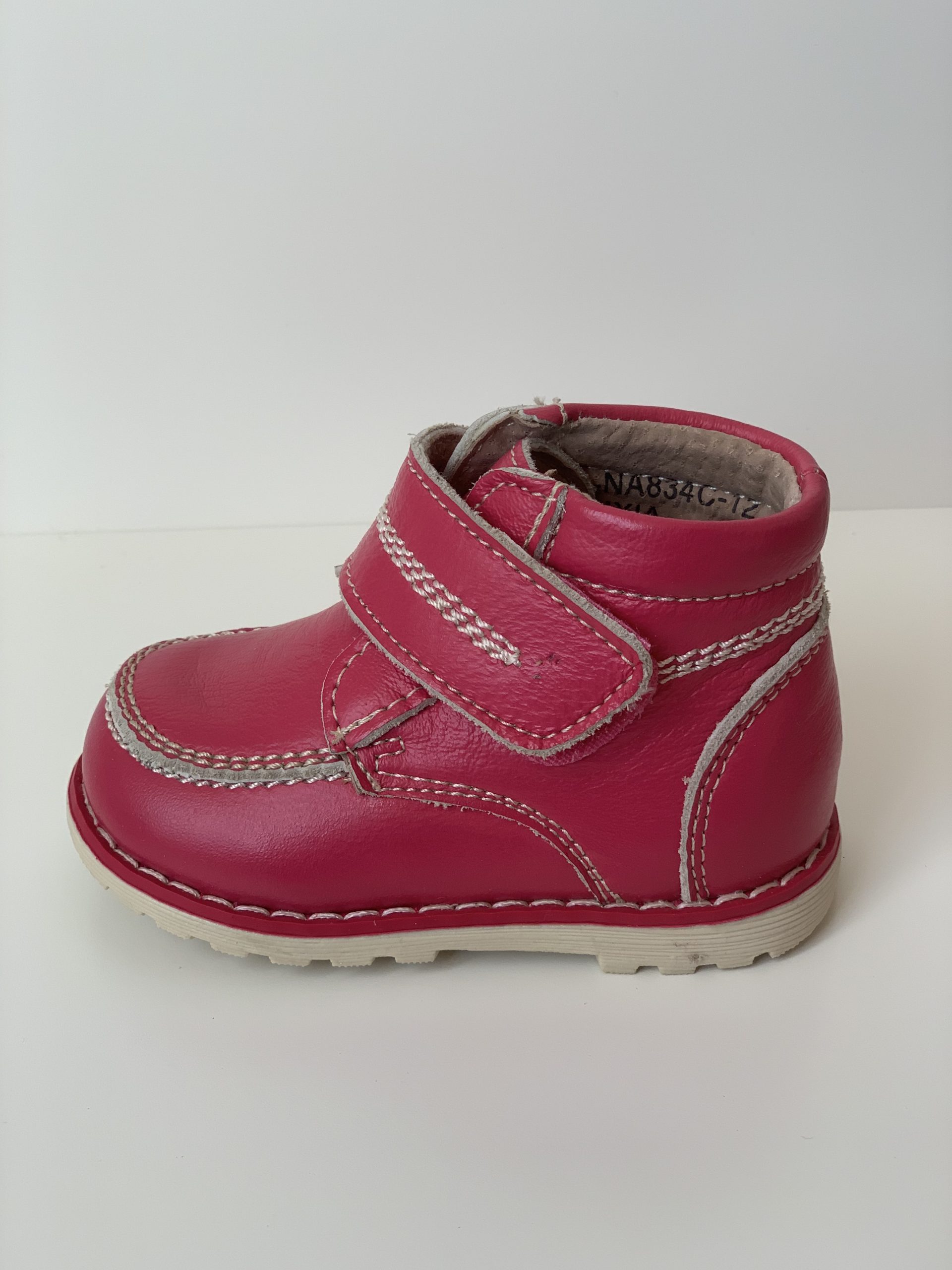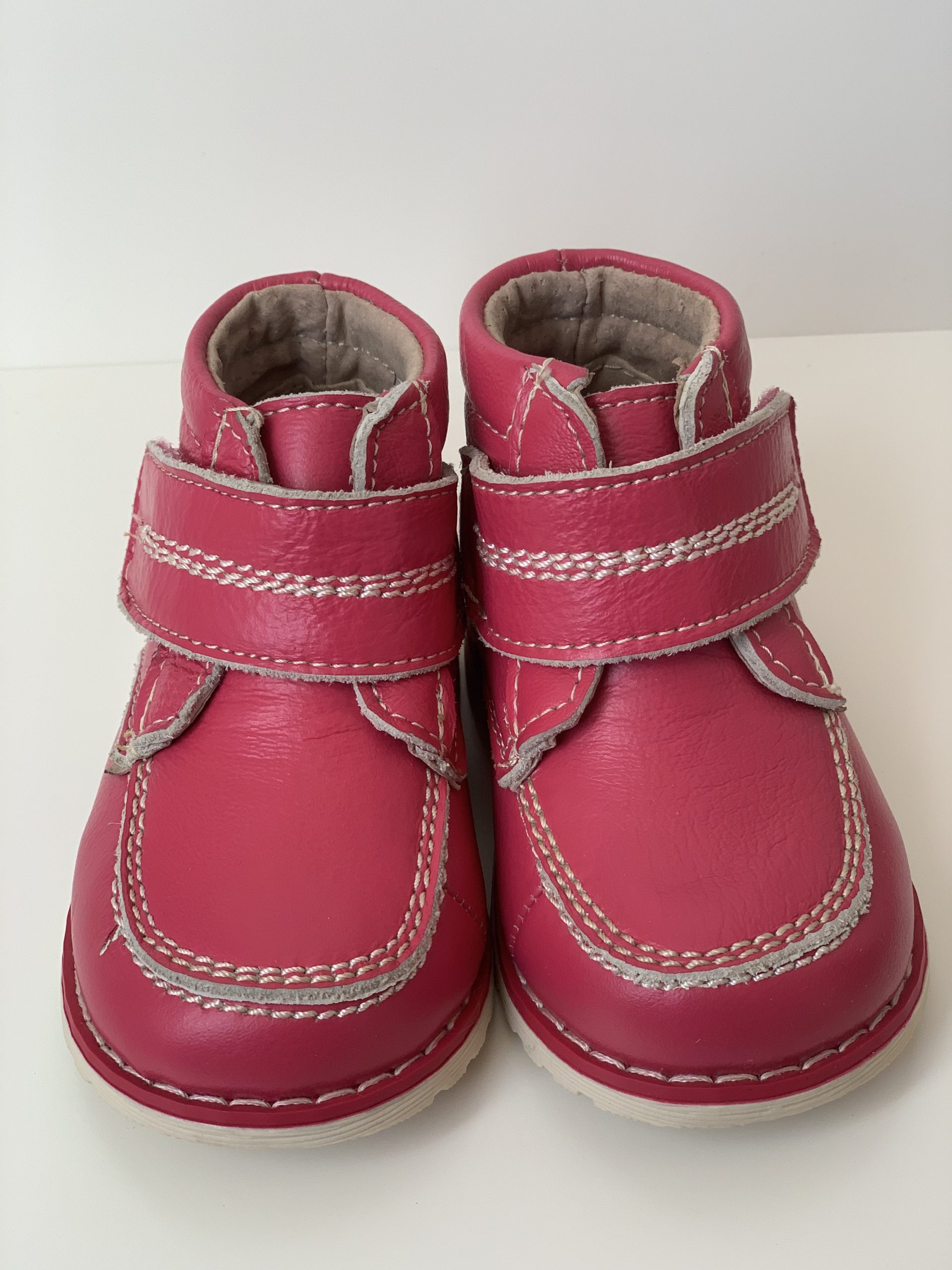 Bota de piel fucsia, perpuntes en color beige, con cierre de velcro y suela en color crema. Son Ideales unisex tipo kickers, para los más pequeños. Hechas en España por Bonino.